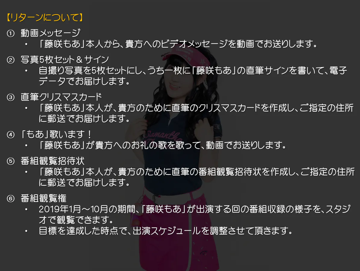 ※2 藤咲もあ が、サンタクロースのコスプレをしたチェキに直筆サインをして、支援時にご指定頂いた住所にお届けします。