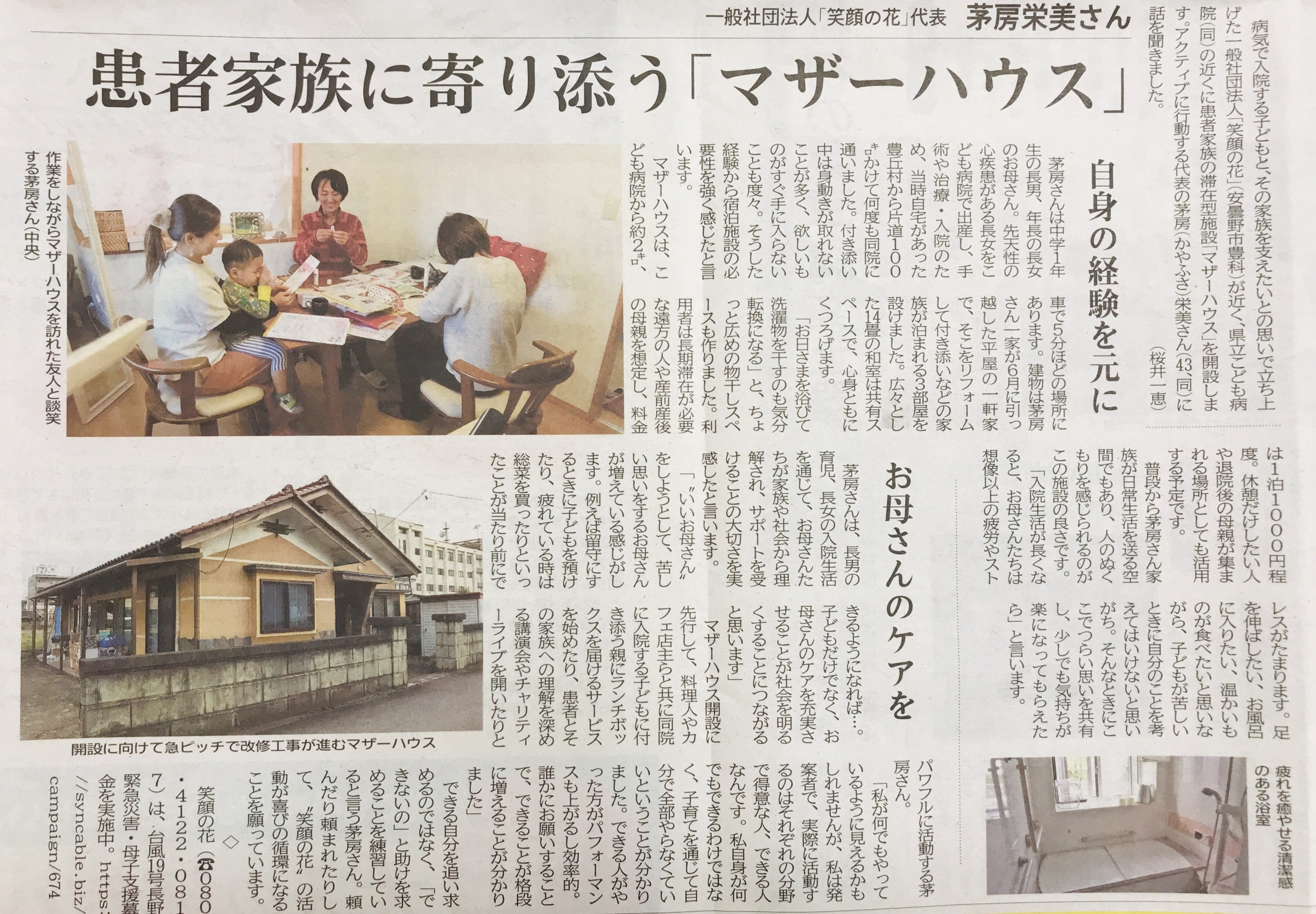病気で入院する子どもと家族を支えたいとの思いで立ち上げた一般社団法人「笑顔の花」(安曇野市豊科)が近く、県立こども病院(同)の近くに患者家族の滞在施設「マザーハウス」を開設します。