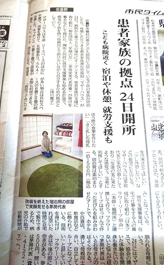 安曇野市豊科の県立こども病院に入院している子どもの家族が宿泊したり、休憩できる患者家族滞在施設「マザーハウス」が24日、病院から車で5分の場所にオープンする。