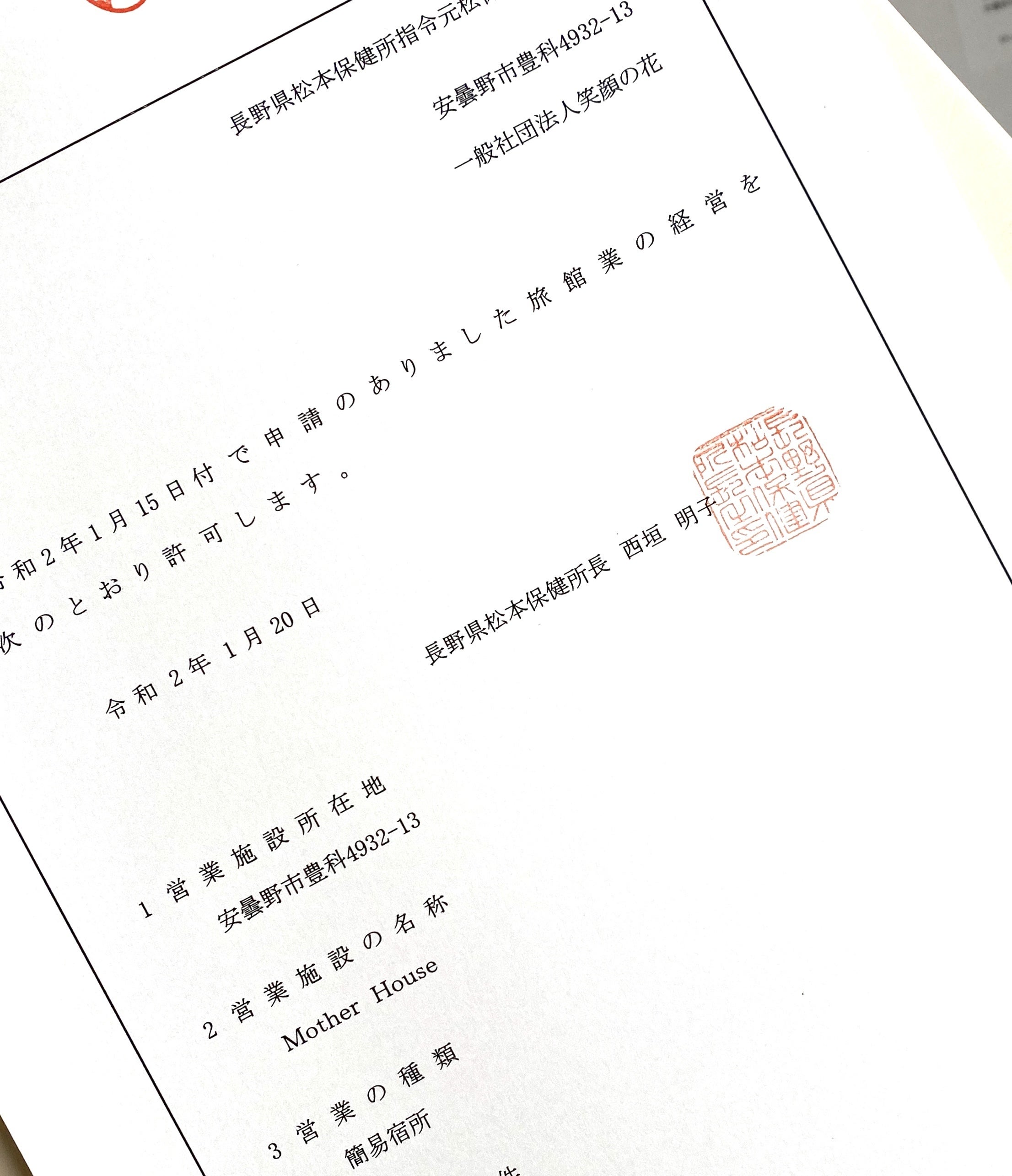 旅館業の許可証を頂きました。