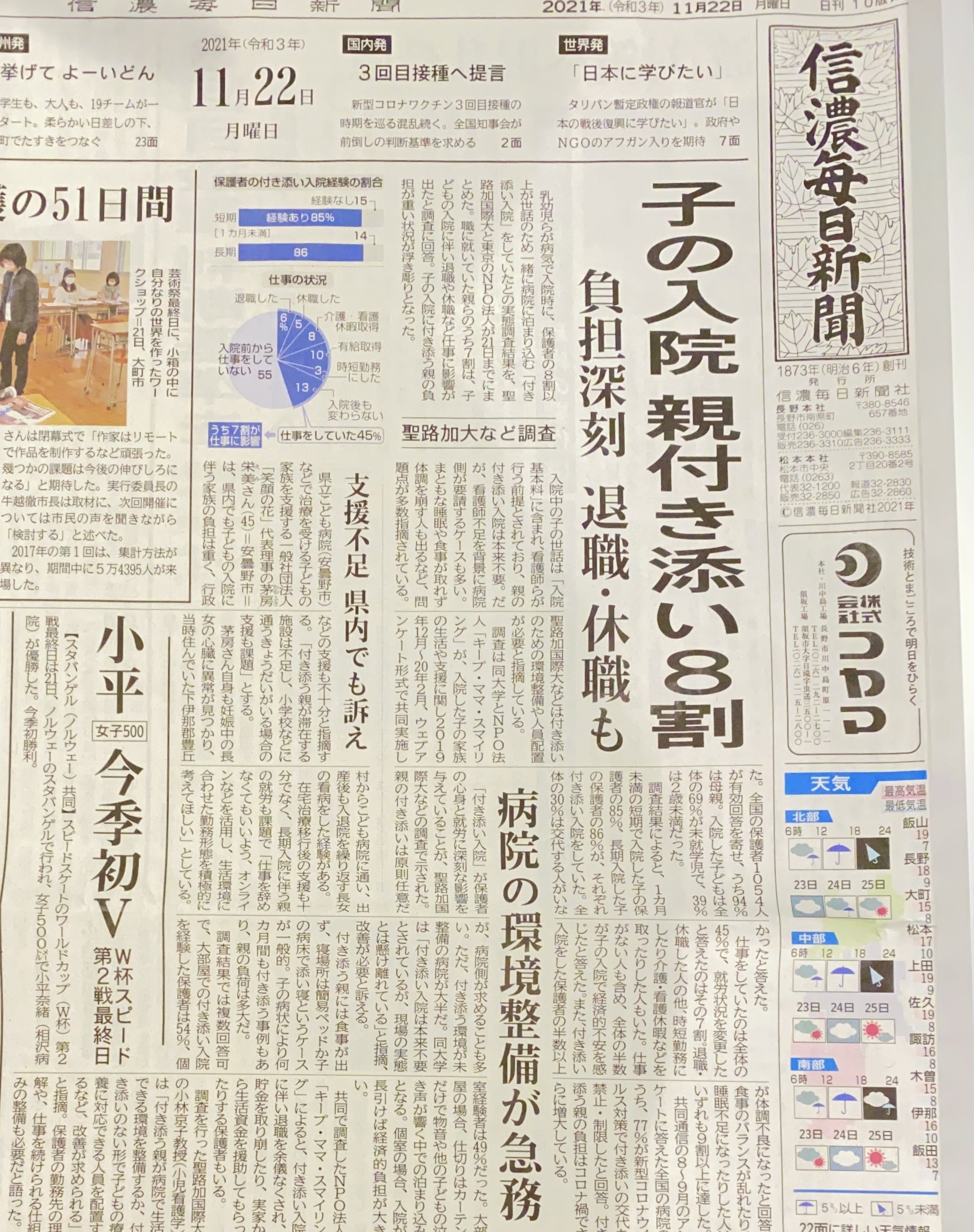 信毎の一面で付添家族のことが