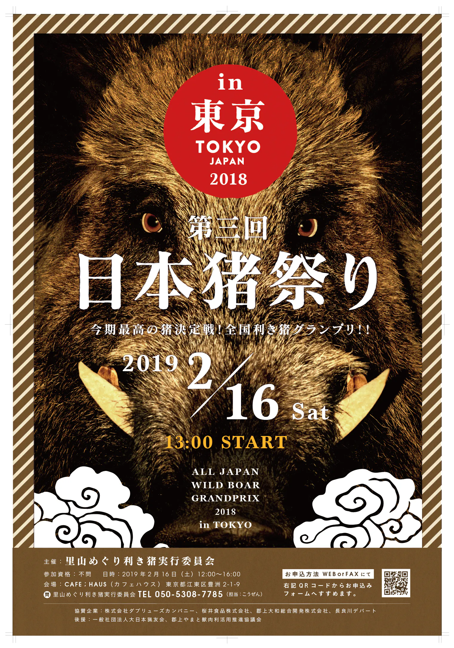 第3回日本猪祭りは2019年2月16日(土)13時より、東京都江東区豊洲のCAFE;HAUSにて開催いたします。BBQコンロで一つずつ、炭火で焼いて提供する利き猪グランプリや熟成肉の巨匠、さの萬によるドライエイジングジビエの調理実演・実食なども行います!