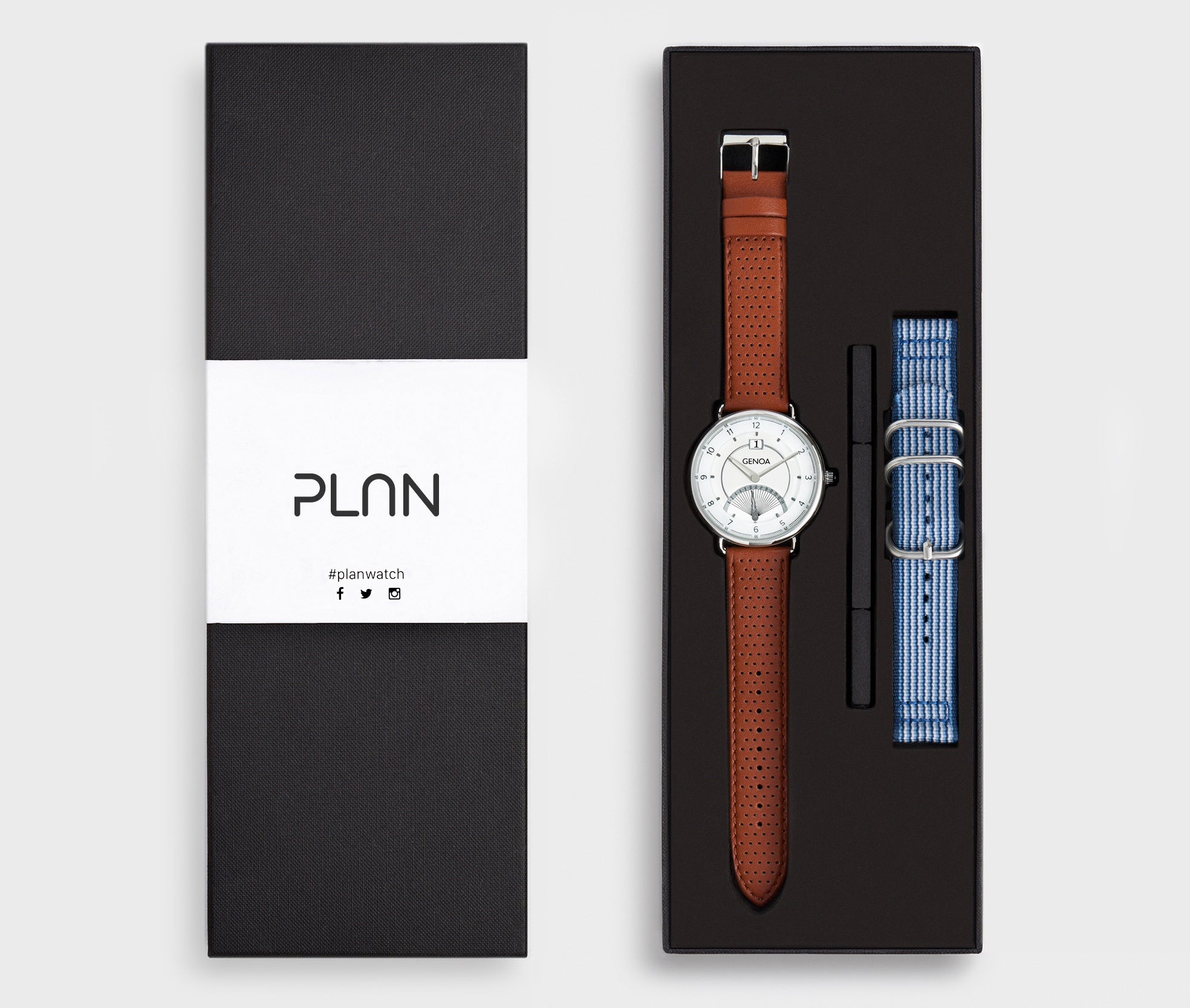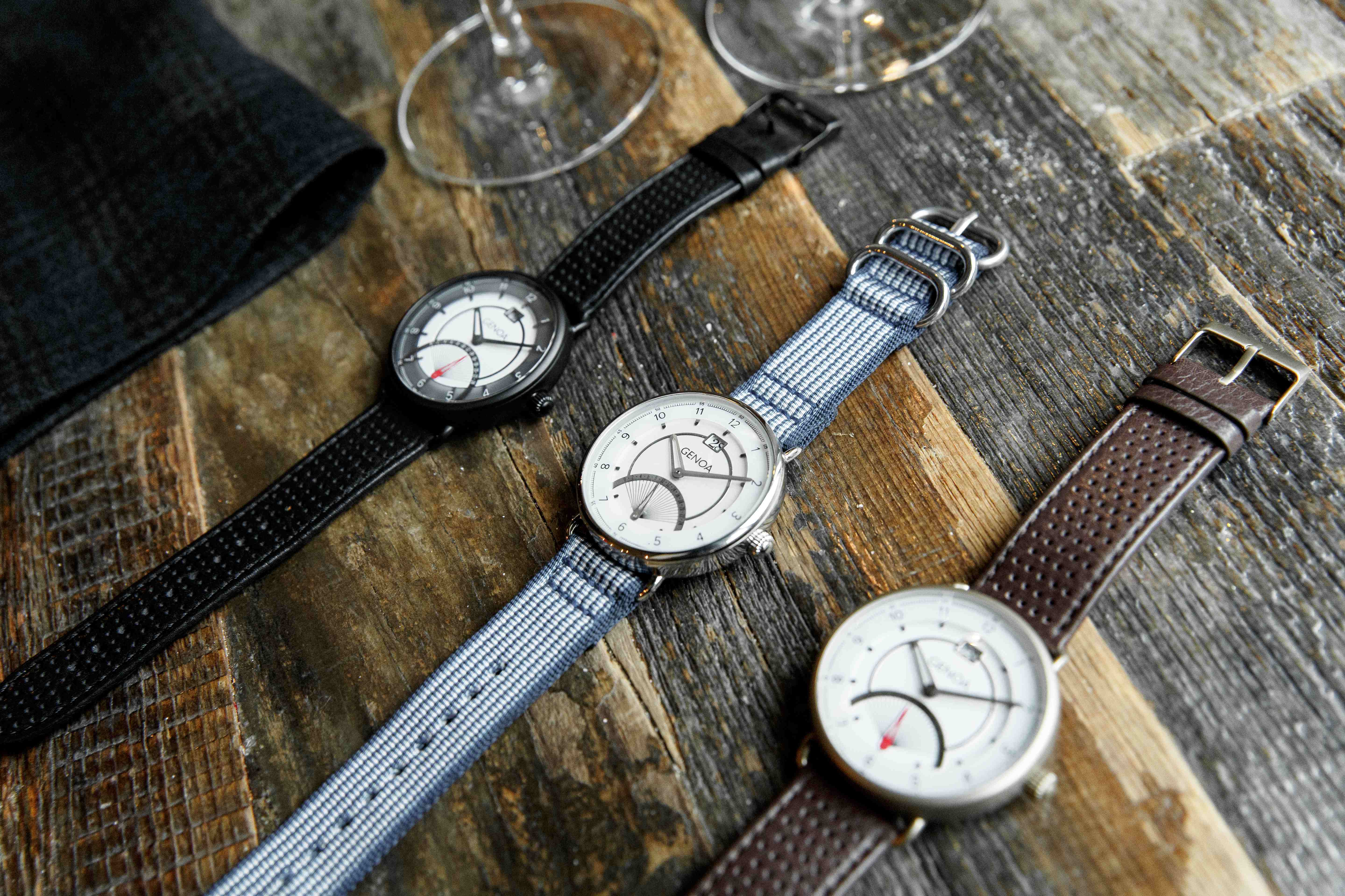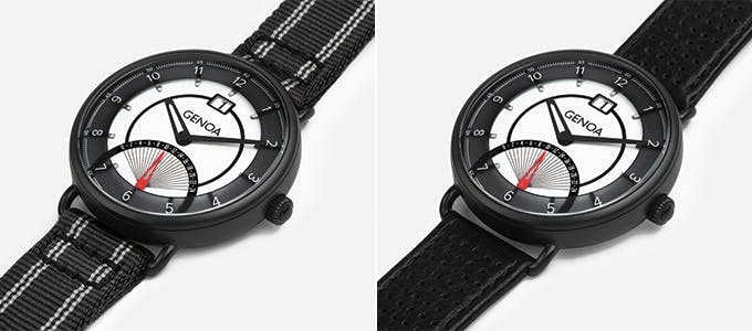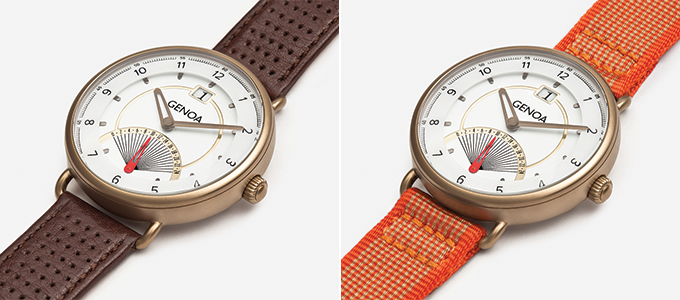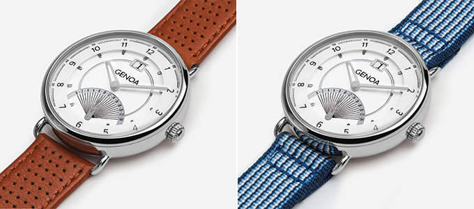 THE Genoaには、レザーストラップとナイロン製のファブリックストラップの2つのストラップが付属しております。その日のファッション、スタイルによってストラップを選ぶことができるので、どのファッション、スタイルにもしっくりくるようにデザインされています。