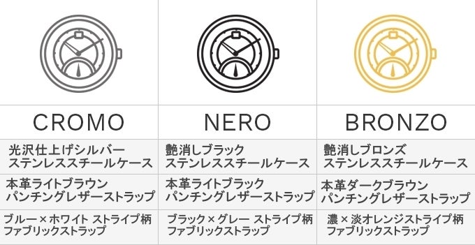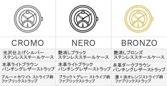 The GENOAには光沢仕上げのシルバーケースの【CROMO】、艶消しブラックケースの【NERO】、艶消しブロンズケースの【BRONZO】の3カラーがあります。