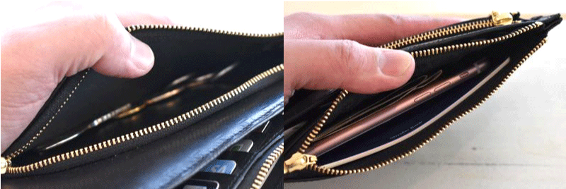 口が大きく開き出し入れもしやすいのが特徴です。お札6枚・100円20枚・鍵1本・カード16枚・通帳1通・スマホ1台を入れてみました、財布の域を超えた充分な収納量です!