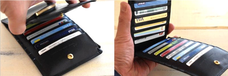 ・バタフライカードポケットの双方一番下段には金具ボタンが取り付けてある為、紙製のカードや名刺などの収納を推奨致します。(金属でカードが擦れる恐れがある為)