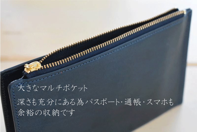 薄型にもかかわらず【大容量】カード・通帳・パスポート・スマホ、そして独立する大小のマルチポケットに収納してもかさばりません。