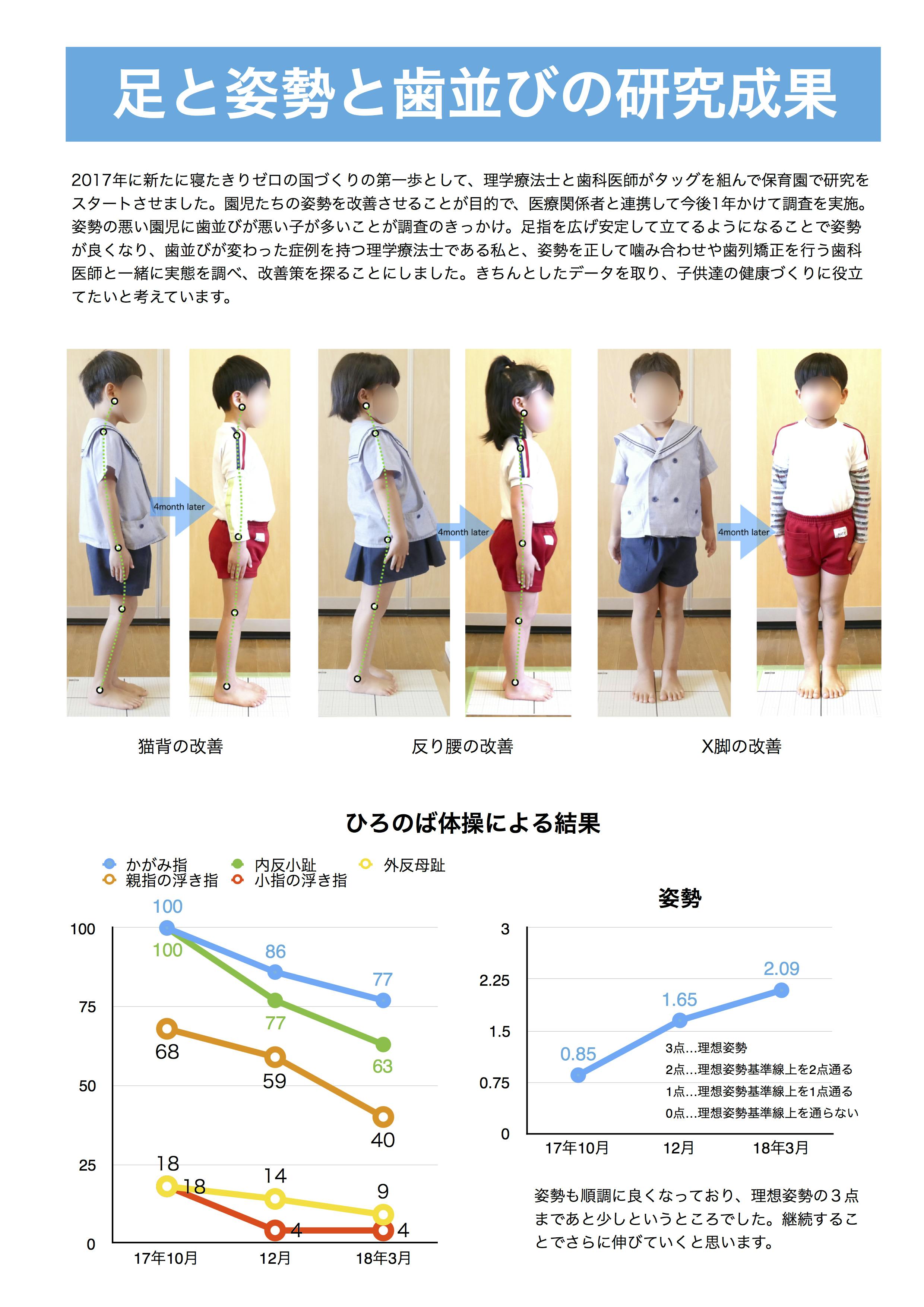 2012年、2017年の保育園調査・研究で、ひろのば体操を行うことで運動能力向上・転倒予防・疼痛改善だけでなく、猫背や反り腰、O脚やX脚などの変形にも改善効果を発揮し、姿勢が改善することによる口呼吸率の低下も実証することができました。もし保育園や幼稚園で、足指の体操によって猫背や側湾症を予防することができれば、日本の健康寿命はもっと伸びていき、年々増加する医療費負担は軽減していくはずです。本年度は姿勢が良くなる靴下のプロトタイプを2つの園に寄贈いたしました。今後も売り上げの一部を利用して、より多くの園に姿勢が良くなる靴下を届けたいと考えています。