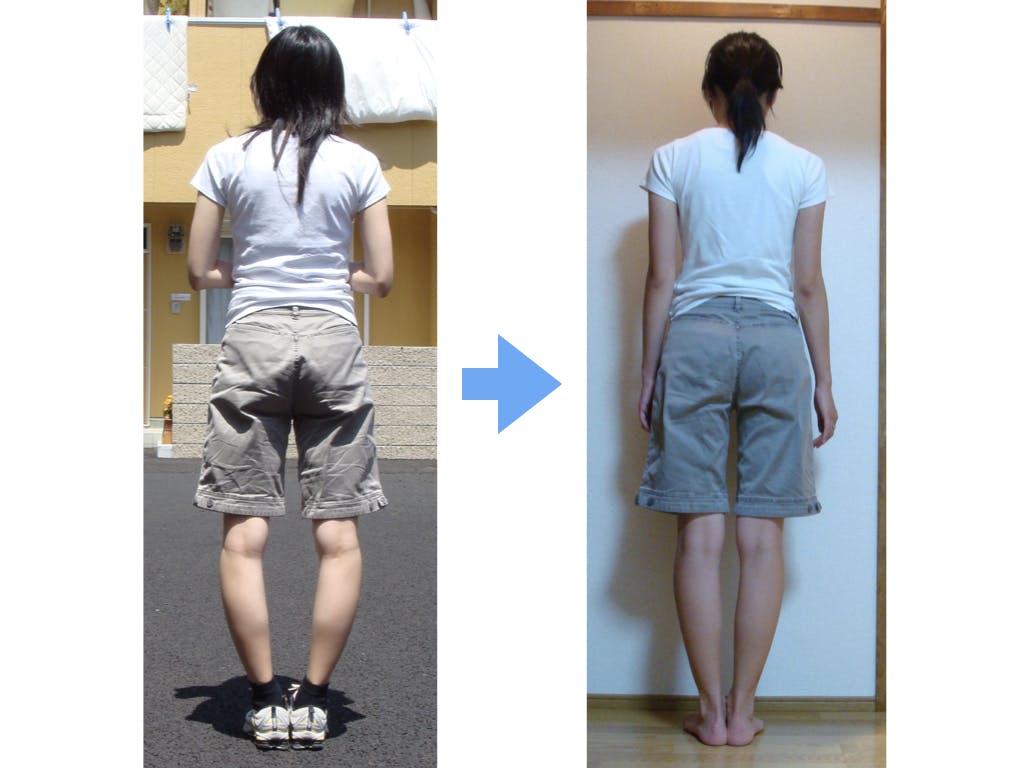 ふとしたことがきっかけで、結婚したばかりの妻の足の小指が浮いていることに気がつきました。 小学生の頃からひどいO脚に悩まされ、ひざ痛や腰痛もありました。痛み止めをよく飲んでいたこ とが印象的でした。試行錯誤しながら浮いた小指を広げたり地面につけるようにしていると、妻が「小指が地面に着く感じがする。脚の内側にも力が入る!」と言って歩き方が変わっていたのです。そして1週間後、奇跡的にもO脚がまっすぐになり、自然にひざ痛や腰痛も消えていったのです。