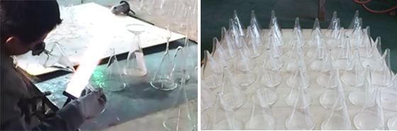 ダブルウォールグラスは職人による手づくりでつくっていますが、スクエアを表現する縦のライン、内側グラスの先端処理、土台の取り付け、グラス底の特殊な形状など、スタイリッシュデザインゆえの問題があり、職人たちの更なる技術力向上を待たなければなりませんでした。