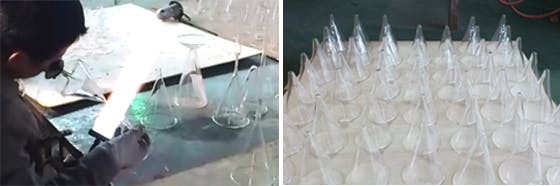 すべて職人が手づくりでつくっていますが、スクエア形状の表現が難しく、内側グラス底の先端処理、土台の取り付けなど、一般的なグラスにはない工程も多いため、商品として販売できるのはわずか30%、残り70%は不良として廃棄処分しています。