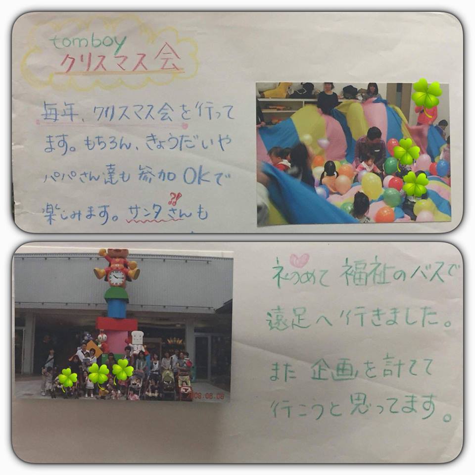 私は2006年9月私自信ダウン症の子を持つ親として茅ヶ崎保健所に相談に行きました。 そこで数人のダウン症児の親と出会い その後2006年11月から神奈川県茅ケ崎市にてダウン症児の親数名で茅ヶ崎女性センターや保健所でtomboy(トムボーイ)として定期的に活動を始めました。