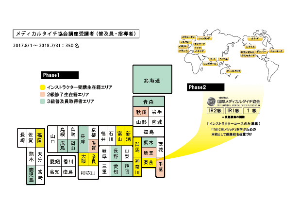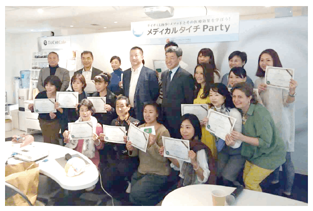 身体のかたい人、運動が苦手な人でも実践できる3次元的円運動がタイチ(太極拳)の特徴です。米ハーバード大学でも「動く医薬」と評されるほどその健康効果は数値として発表されています。これからの人生100年時代に向け、現代人の身体に優しい、がんばり過ぎず長く続けられる確かなメソッドを目指し、世界の太極拳選手たち、そして日本の大学病院の医師の皆さまと共に講座を作ってまいりました。現在講座がスタートし1年が経ち、全国で350人の普及指導員の認定が行われました。
