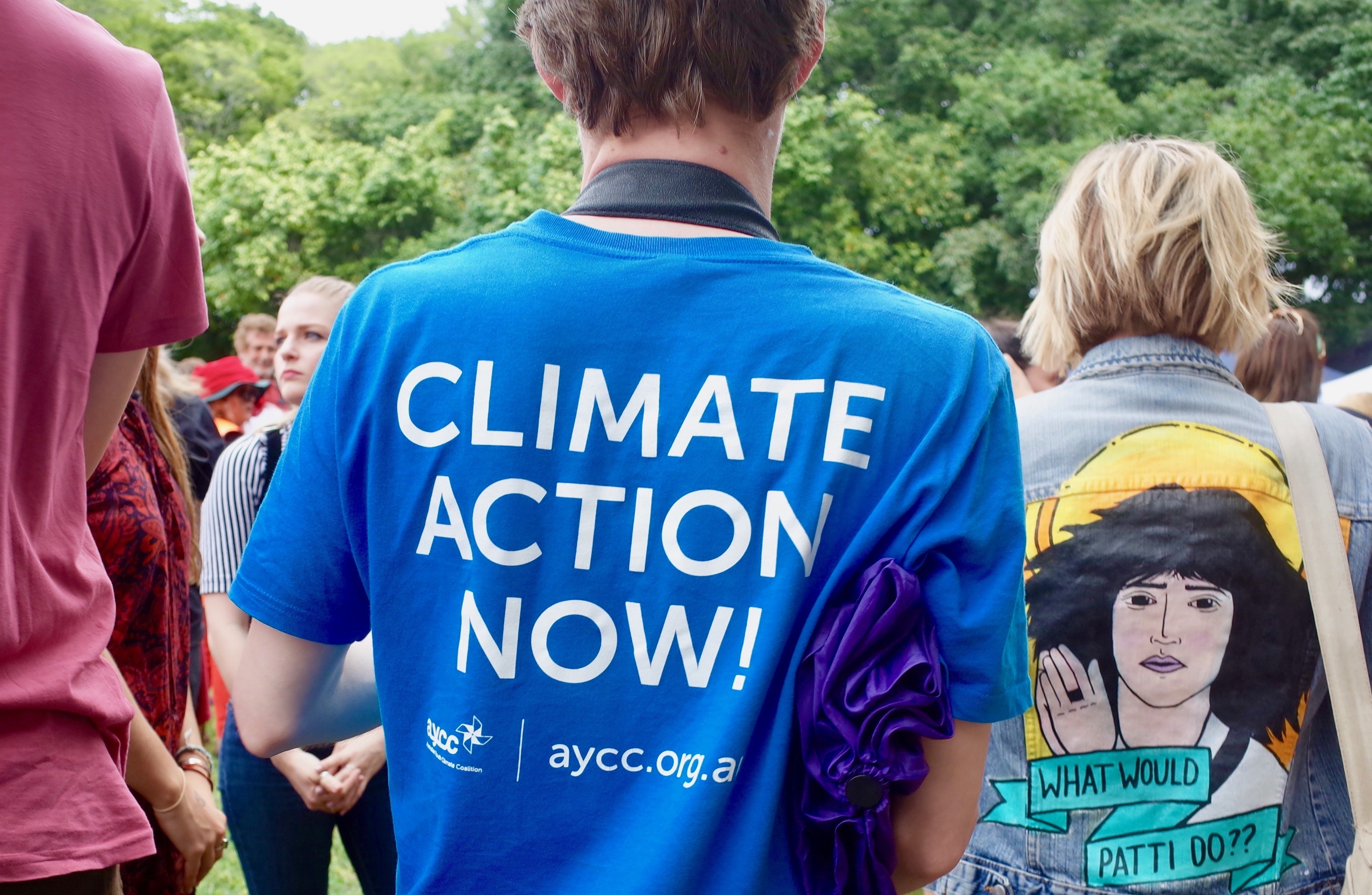 「Climate Action Now!(今すぐ気候変動にアクションを!)」と書かれたTシャツを着て活動をするオーストラリアの若者団体の青年。日本でもこのくらい気候変動が身近な話題になってほしいと思っています。