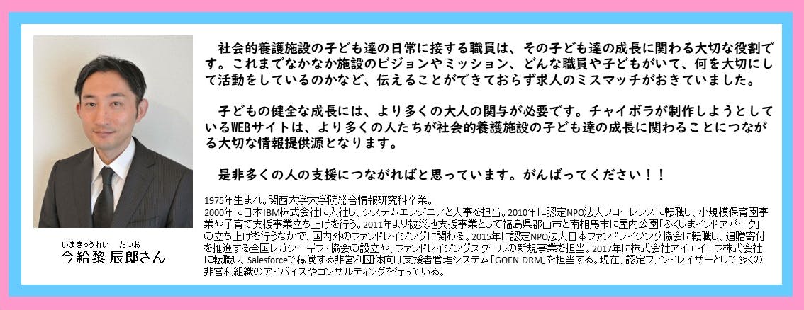 認定ファンドレイザー 今給黎 辰郎(いまきゅうれいたつお)さんから応援メッセージをいただきました。