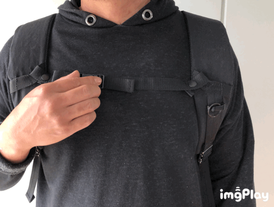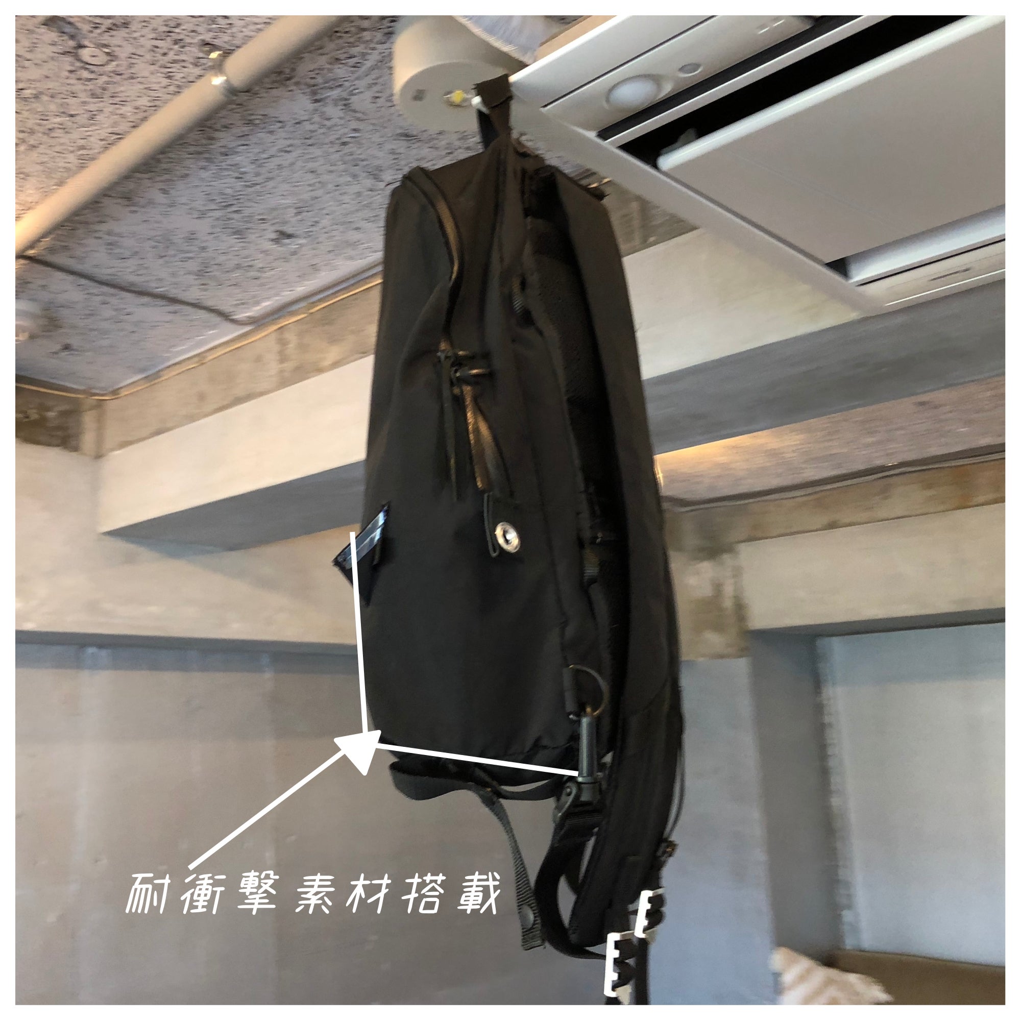 PCなどが入る収納を高い位置に配置することで重心を上げ、遠心力による肩への負荷も軽減し、落下によるPC等の損傷も防ぎます。
