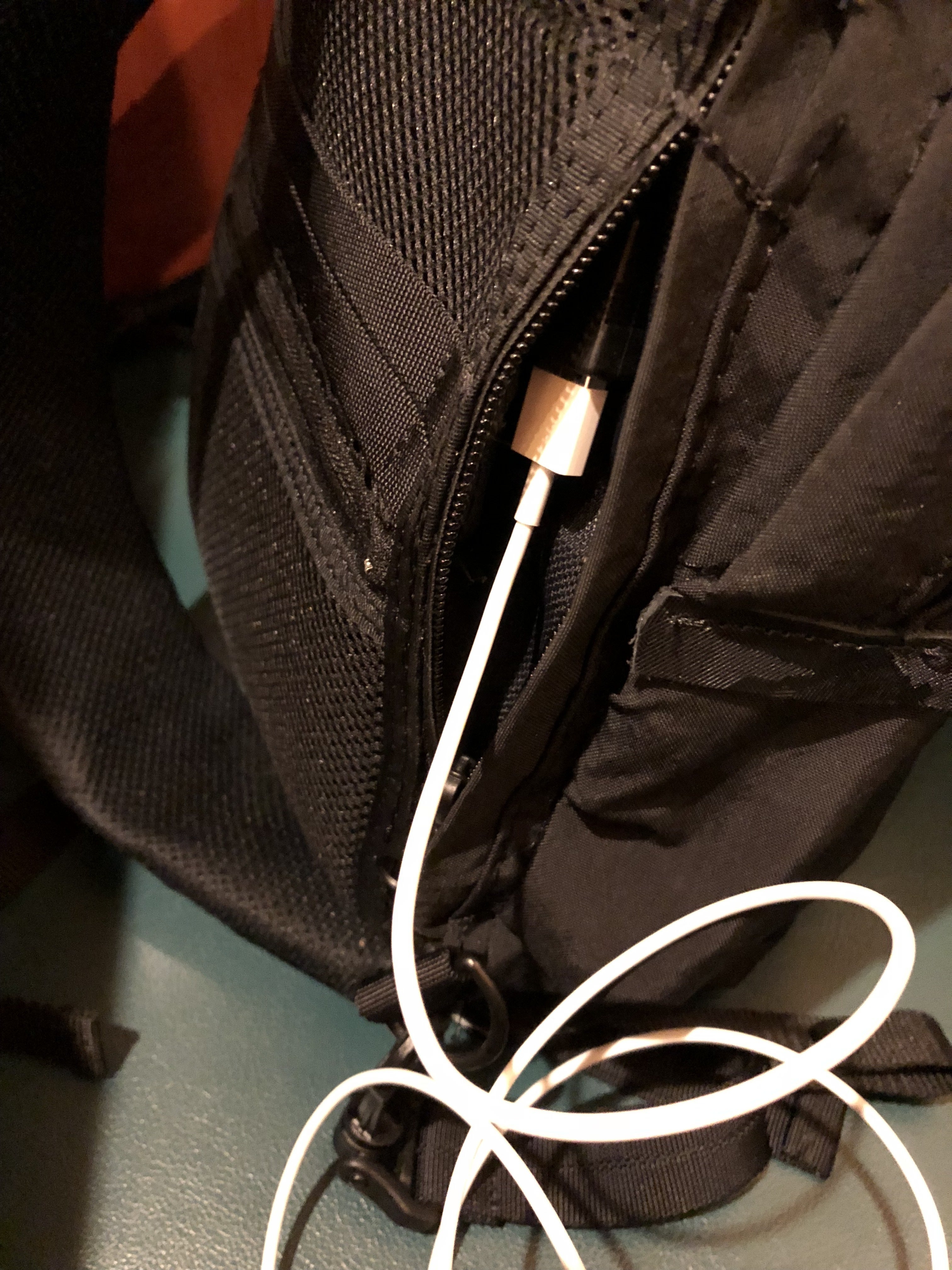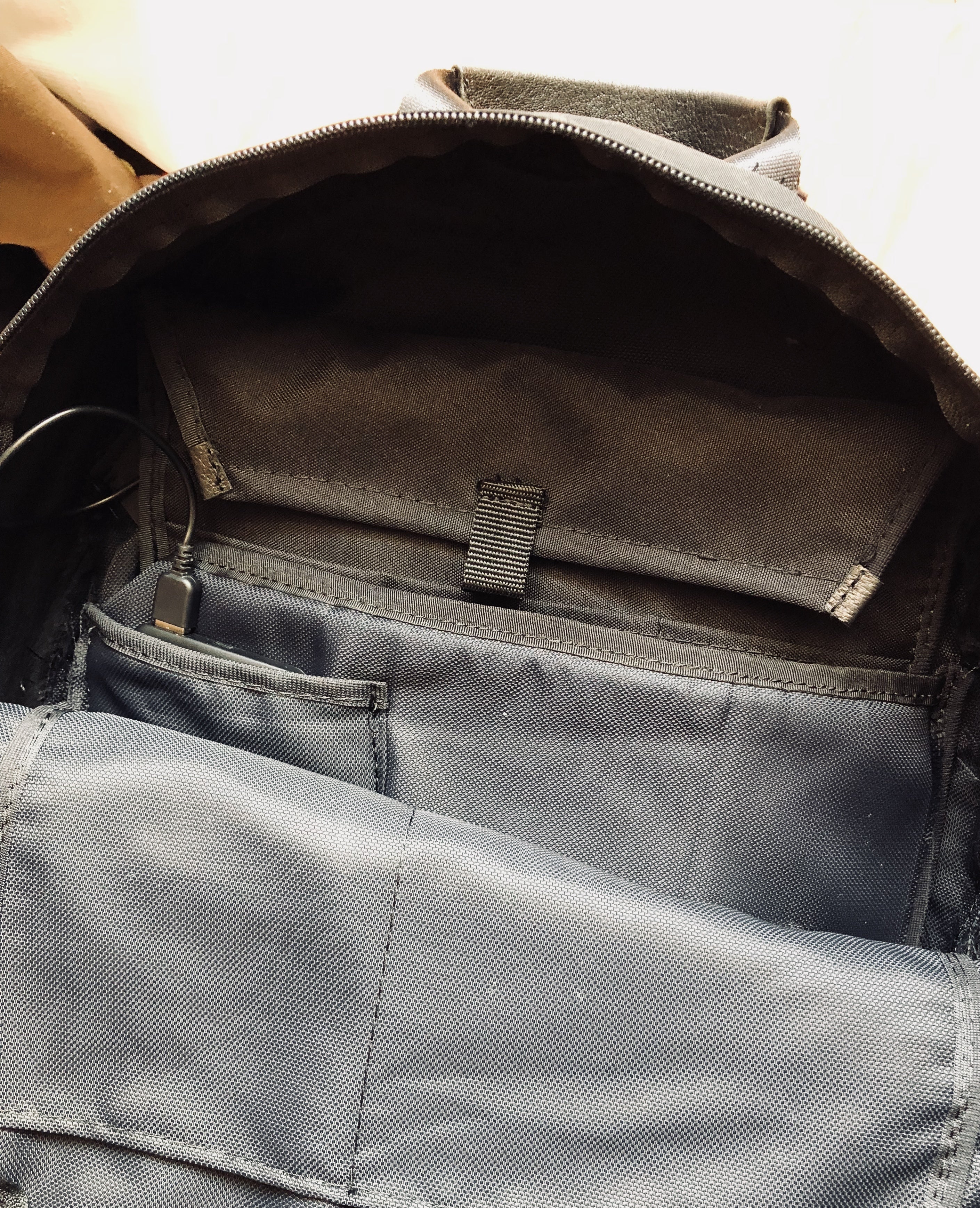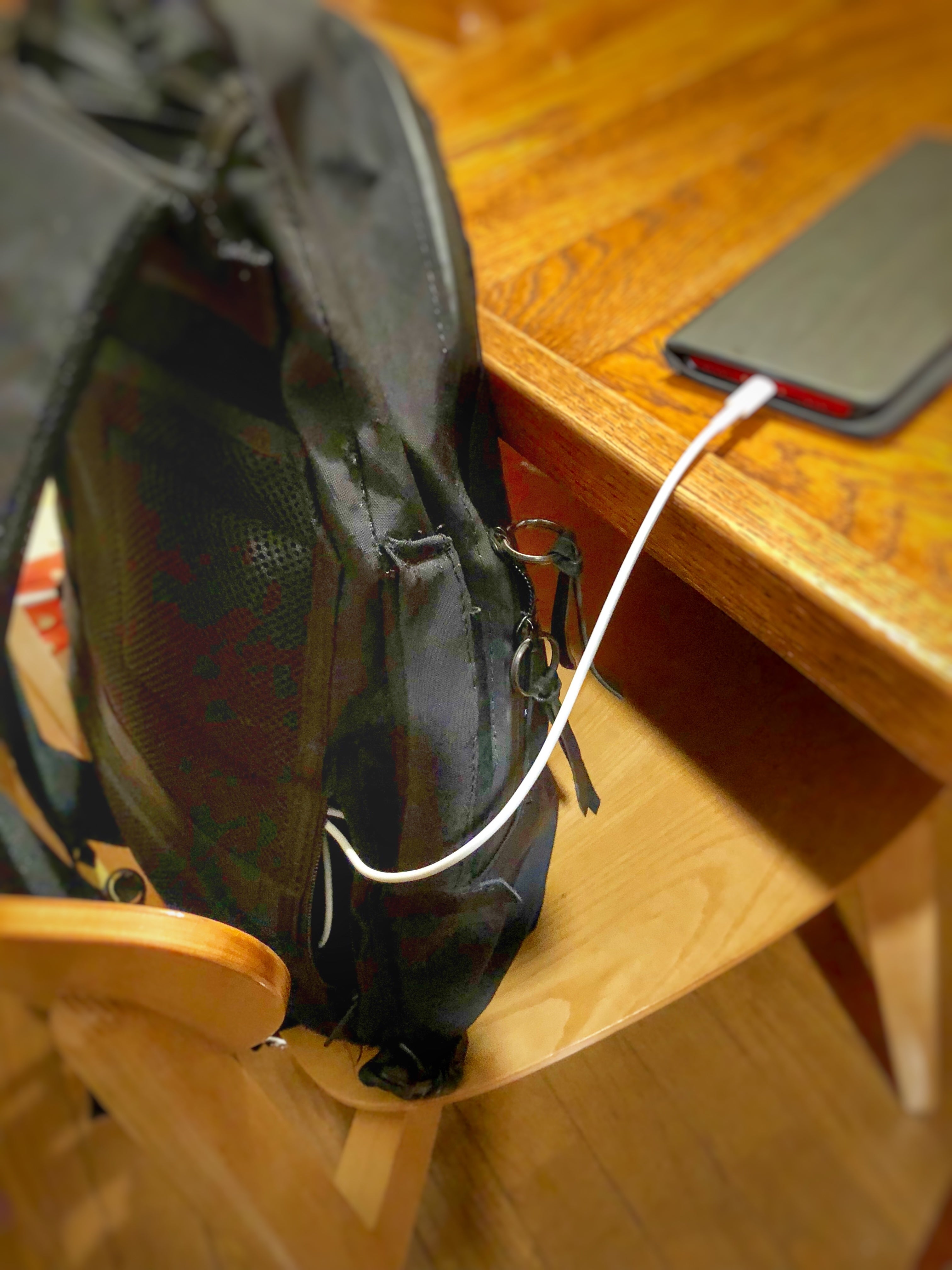 隠しポケット2内部にUSBポートを設け、外での急な充電に対応します。