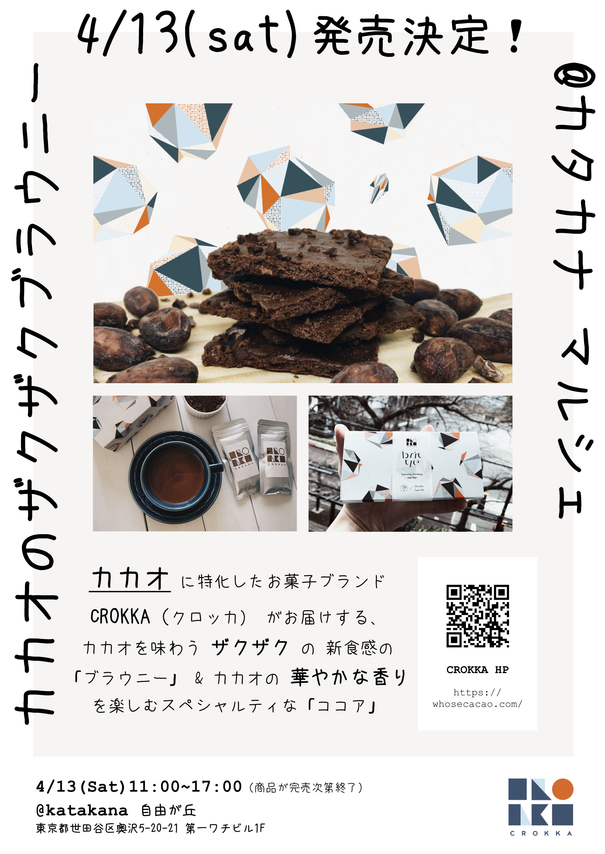 2019/04/08 14:14CROKKAブランドの3商品を、フーズカカオのオンラインショップ以外でも今週よりご購入いただけるようになります!▼販売をスタートする商品① CROKKA brittle(オリジナルボックス入り)【商品情報】ブラウニーの生地に香り豊かなカカオ豆を砕いたもの(カカオニブ )をのせて、薄く焼き上げたお菓子です。1箱あたり「カカオポッド約1個分」のエンレカン産カカオ豆を使用しています。カカオの風味をダイレクトに感じられるように香料は使用せず、なるべく余分なものは排除することで、存分に素材の香りや食感を楽しめる仕様にしました。オリジナルボックス入りは贈答用にピッタリです。・価 格:1,370円(税別)・内容量:1箱(10枚)・原材料:チョコレート(カカオ分70%)、バター、砂糖、ココアパウダー、卵、小麦粉、ベーキングパウダー、塩、牛乳、カカオニブ② CROKKA brittle(mini)【商品情報】CROKKA brittleのお徳用ミニバージョン。自分用に最適な仕様です。・価 格:350円(税別)・内容量:1袋(3枚)・原材料:チョコレート(カカオ分70%)、バター、砂糖、ココアパウダー、卵、小麦粉、ベーキングパウダー、塩、牛乳、カカオニブ③ CROKKA cocoa【商品情報】今までにない新ジャンル「スペシャルティ・ココア」が誕生!従来のココアでも、ホットチョコレートでもない新しいカカオドリンクが誕生しました。長年世界中で愛されているココアの飲みやすさを残しつつ、年々注目度が高まる「ビーントゥバー」に代表されるクラフトチョコレート特有のフルーティな香りを感じられます。・価 格:1,000円(税別)・内容量:1袋(20g)× 5包・原材料:カカオ豆、ココアパウダー、てん菜糖、バニラビーンズ▼販売場所Alpha Beta Coffee Club販売開始:2019年4月10日(水)〜場 所:東京都目黒区自由が丘2-10-4 ミルシェ自由が丘 3Fカタカナマルシェ販売開始:2019年4月13日(土) ※1日限定販売時 間:11:00~17:00(商品が完売次第終了)場 所:東京都世田谷区奥沢5-20-21 第一ワチビル1Fご質問はCAMPFIREのメッセージにて、お問い合わせください! もっと見る