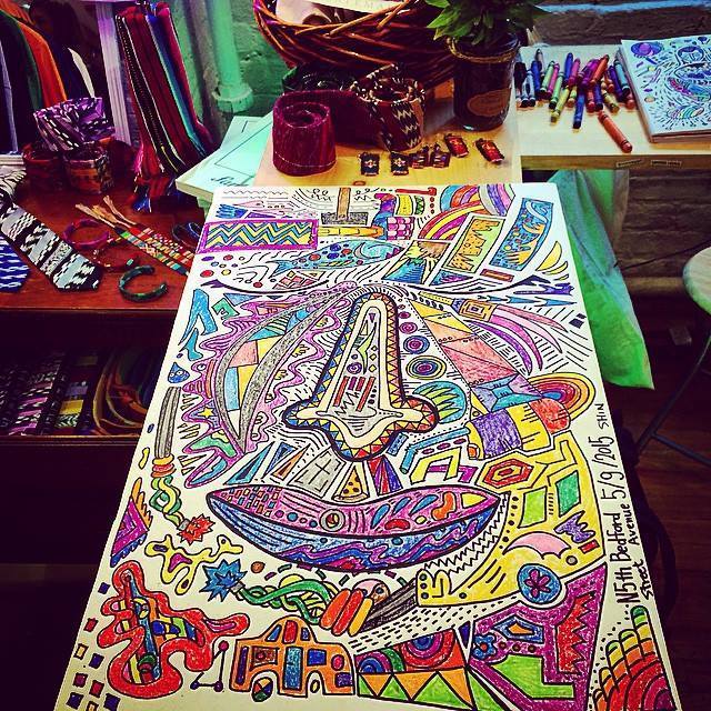 2018/12/24 09:18本日Day16で折り返しです。半分まで来ました!毎日が濃く、そしてあっという間でもあります。Day4 Fifth Avenue (Tiffany前)5番街で描こう!と思い向かってみると、クリスマスシーズンの為恐ろしいほどの人混み。たまたまTiffanyの目の前がフェンスがうまい感じに立っていて人がたまらないようになっていたので、結婚指輪を買った思い出の場所ということもあり、ここで描くこと決めました。ちなみに背中はTrump tower。そっち向いて何か描いてもよかったけど、セキュリティーもいて変なトラブルになったら嫌だなと思い、そちらは諦めました。いつも何描くか全く決めずに描き始めるのですが、まず目に入ったTiffanyのロボットのインパクトが強かったのでその顔を描き始めました。一筆(ペンだけど)入れると勝手にどんどん進んで行くので、自分もいつもどこに着地するのかわからずただただその時に降りて来たものを描きます。アメリカ国旗が遠くではためいていたので描いたのですが、後ろのトランプタワーの妖気にあてられてなんだか溶けたような、ぐにゃりとしたものに変形しました。爽やかなものを描こうと思ったのに、この時勢の影響を受けてなのか、あまりに多くの人たちが周りにいたからなのか、雑然とした作品になりました。また、アーティストでありUtah大学のアートの非常勤講師のJimmyさんという方に話しかけられました。だいたい話しかけてくるのは自分もアーティストだという人か、ローカルor観光客で、たまに買いたい!という人もいます。こうやったら売れる!とか言ってくる人もいたけど、その話はまた別の時に書きます。↑TiffanyのロボットDay5 Brooklyn Bridgeこれは今回の旅で1,2番の寒さの中描きました。そしてとにかく揺れる!人もめっちゃ多い!自分自身の肉体とメンタルとの戦いでした。イーゼルも風ですぐ倒れるので、養生テープで橋のロープに無理やり固定して描きました。ほぼブルックリンブリッジ要素ないやん!と思うでしょうが、よくみると下の真ん中ちょっと右に橋の一部が描いてあったり、遠くの景色が混ざっています。また、その日は後光が差しており、その光も描いてあります。毎日描く時に悩むのですが、この時は自分の得意なスタイルと、景色を入れる、ということがまだ整理がついておらず、描きたいように描けばいいのに色々な思いが交差し始めた時です。そしてこの日の夜、元ルームメイトに誘われてBushwickにあるコワーキングスペースで"Drink and Draw"というイベントに参加しました。ここは$10払うと缶ビール飲み放題(Brooklyn Lagerが協賛!)で、ヌードモデルが一人おり、2-30人がひたすらそのモデルを描くというものでした。毎回モデルは白人黒人男女痩身肥満、、色々ランダムに決定するらしく、その時は白人の細い女性モデルでした。僕は基礎が全くないので、これはいい訓練になりそうだなと参加してみましたが予想以上に面白かったので、日本でも形を変えて開催したいと思います。↑自分のポップなスタイルとデッサンを融合させてみましたまた、この夜Ian Cincoさんというアーティストとも繋がり、彼の家でその後少しパースなど基礎について教えてもらいました。彼の絵はグロテスクなものがありますが、精密で、本当に毎日描いてるんだなと思わせる確かな技術でした。彼の本を買ったらスラスラと15分程度でイラスト付きのメッセージまで添えてくれました。めちゃ優しい。初対面の人の家なので写真撮れなかったんですが、家の中もかなりクリエイティブでした。Day6 Bedford Avenue station platformこの日は完全に前日の夜の影響を受けて、早速練習してみました。機械は難しいし、角度つけるのもフリーハンドで描くのは本当に難しい!人に至っては動くし本当に無理。なのでここに描かれている人々はそれぞれ別の時間にいた人たちが描かれています。真ん中だけイメージで自分を描きました。面白いのが、基本的に完全ゲリラで描くので、許可もとらず、どきなさいと言われるまで描いているんですが、ここではサブウェイの職員たちも応援してくれて、"俺のことを入れるのを忘れんなよ!"とか笑いながら言ってくれます。ちなみにそのおじさんの後ろ姿も入っています。普段はアブストラクトな自分の中の概念や直感を絵にするのですが、風景を真剣に描いたのはもしかしたらこれが初めてかもしれません。めちゃくちゃ難しい!!けど、10年、20年と時が経った時に、現在の風景を自分なりに切り取って保存できるというのは面白いし、貴重だなと新鮮な気持ちになりました。ここで自分のスタイル"フリースタイルでポップに描く"ものから、"下書きをしてありのままを写す"というある意味真逆のことをすることで、自分の中に新たな葛藤も生まれましたが、何よりも絵を描くことがやっぱり大好きだなと改めて感じました。この日を境にスタイルに変化が出て来ましたが、それはまた改めて書きます。あとたった2週間、されど2週間、自分の全身全霊をかけてぶつ