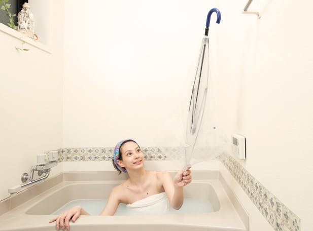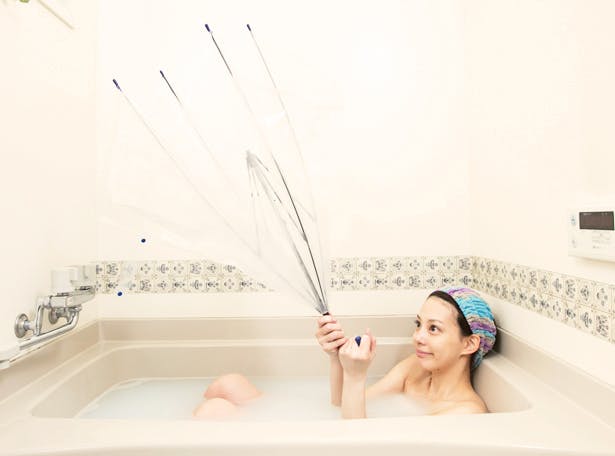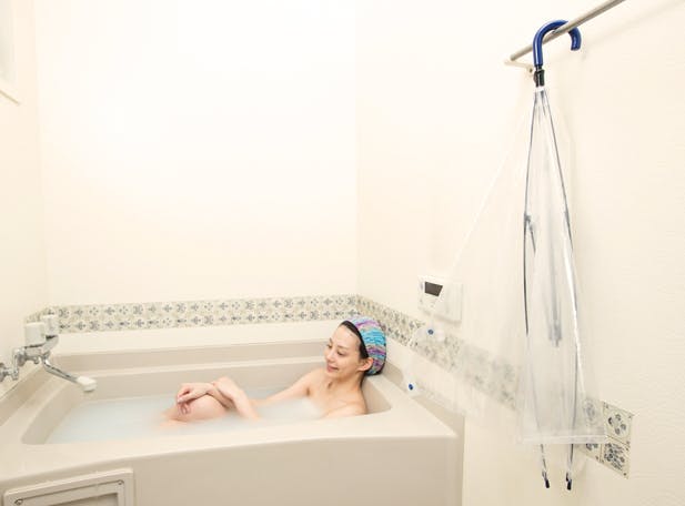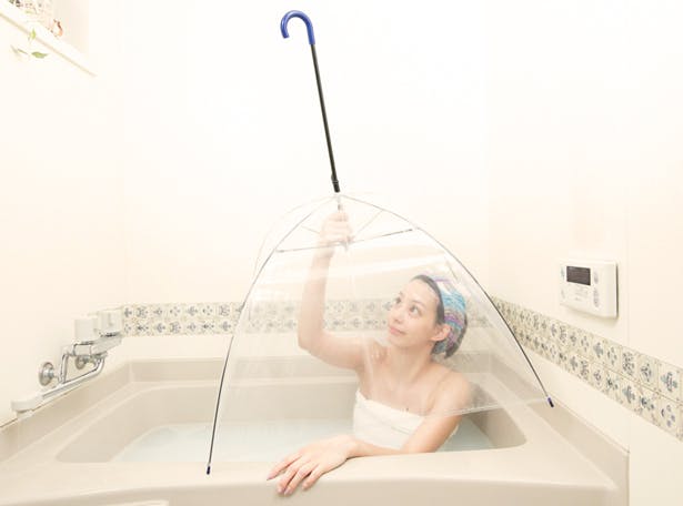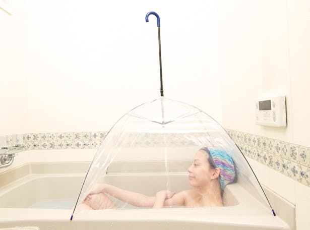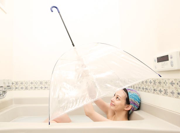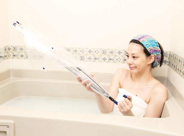 体が徐々に火照り、5分後には写真(あり)のように傘内側だけでなく体も温まってきます。(※お風呂の形状により異なりますので予めご了承下さい。こちらのお風呂は一般的な奥行き70cmで横が両足がちょっと窮屈なバスタブとなります。)