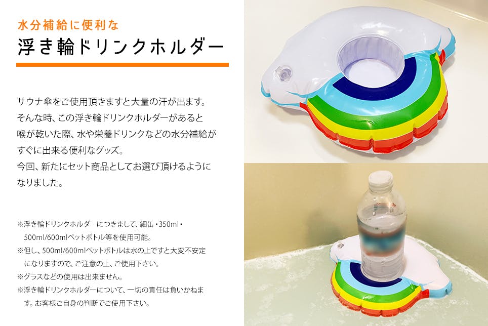 今回、特別チャレンジとして、こちらのリターンをご用意させて頂きました。サウナに入ると汗が大量に出ます。そんな時、この浮き輪ドリンクホルダーにドリンクをセットして水分補給が出来ます。冷たいドリンクをセットするのも良し。凍らしたドリンクを溶かしながら最適な温度で飲むのも良し。サウナ傘をご使用頂きながら、お好みの温度で水分補給を行って下さい。