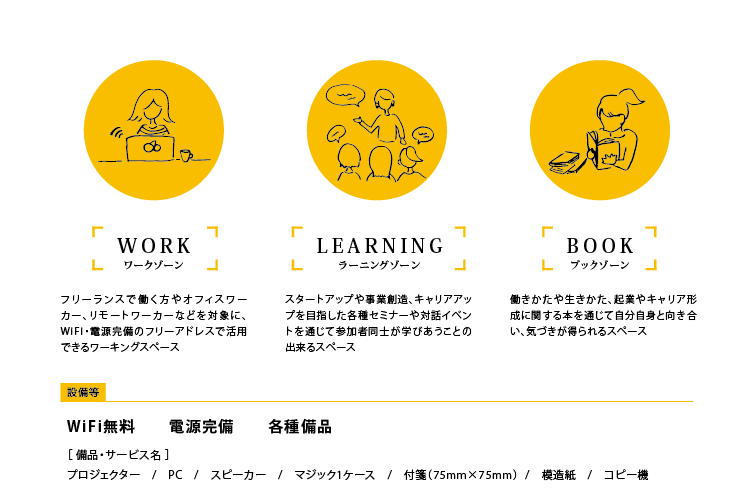 フリーランスや学生、出張者や旅行者のワークスペースとして、また、リモートワークを実施する企業のワークスペースとしてコ・ワーキングスペースを提供するほか、地域や世代、組織を超えて多様な人が学び合うコ・ラーニングスペースを提供します。