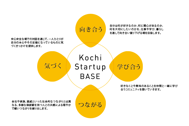 Kochi Startup BASEは、安心して自分の想いを語り合える仲間と共に、誰もが自分の「好き」「やりたい」に従った小さな一歩を踏み出すことを繰り返しながら、徐々に影響力の環を広げていく、社会的な価値を生み出す考え方、価値観、行動を育むことを目指しています。