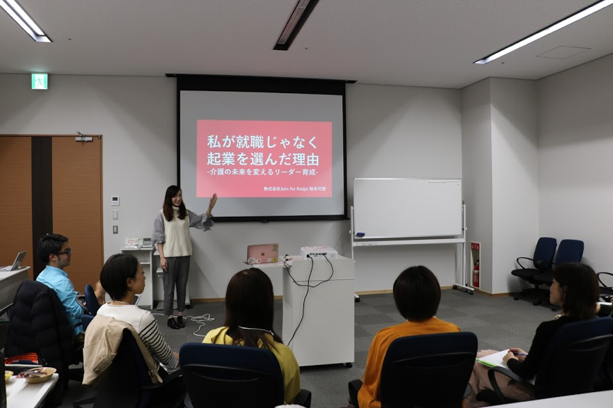 『私が就職じゃなく起業を選んだ理由-介護の未来を変えるリーダーの育成』と題して、起業するまでの経緯や、現在のチャレンジ、そして、目指す未来についてお話いただきました。