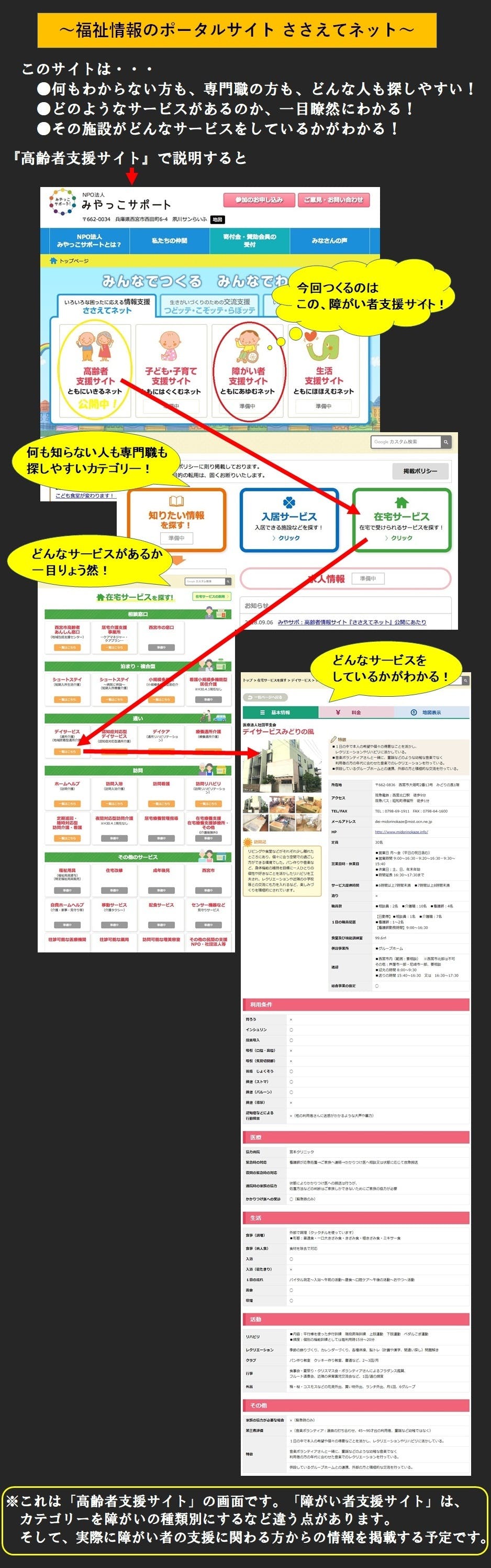 そのような中、みやっこサポートさんが現在取り組もうとされている「福祉情報のポータルサイト」は、先駆的な試みだと思います。相談したくても行くことが難しい方や、時間的に難しい方が、情報を得る第一歩となるサイトになるのではないかと思います。この取り組みが実行され、広がっていきますように願っています。