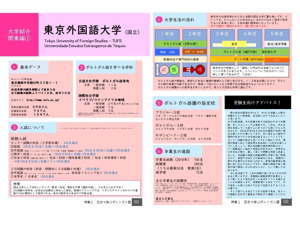 このフリーペーパーは①ポルトガル語を専攻する大学に入学してきた新入生に、ポルトガル語の教育の現状をお伝えすること、②外国語を学びたいと思っている高校生などに、ポルトガル語の魅力を伝え、ポルトガル語人気を向上することを目的に発行します。執筆・編集などすべてをポルトガル語を専攻する学生が行います!