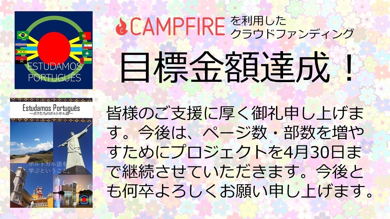 2019/04/20 01:13皆さんこんにちは。学生団体Estudamos Português!代表の北川惠太です。この度、3月1日より実施しておりました、クラウドファンディングプロジェクトの総計が目標金額となる500,000円を突破いたしました。この度、ご支援いただきました皆様に厚く御礼申し上げます。また、私どものクラウドファンディングのプロジェクトは、部数・ページ数の充実を目標に、4月30日まで継続いたします。皆様の引き続きのご支援何卒よろしくお願い申し上げます。今後とも何卒よろしくお願い申し上げます。 もっと見る【ご支援いただきました皆様限定】表紙のデザイン変更案について