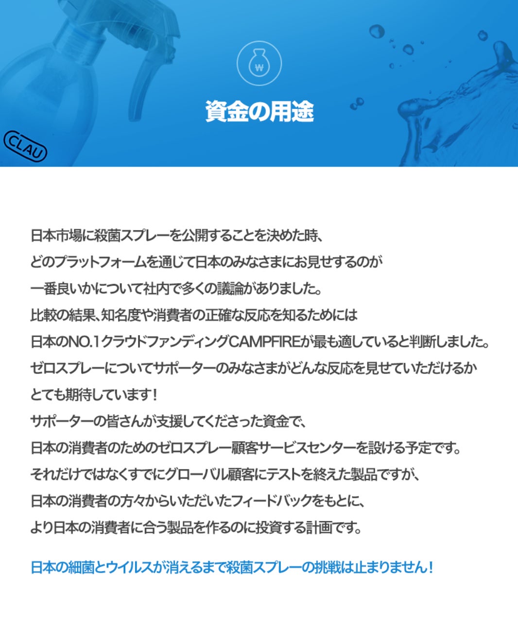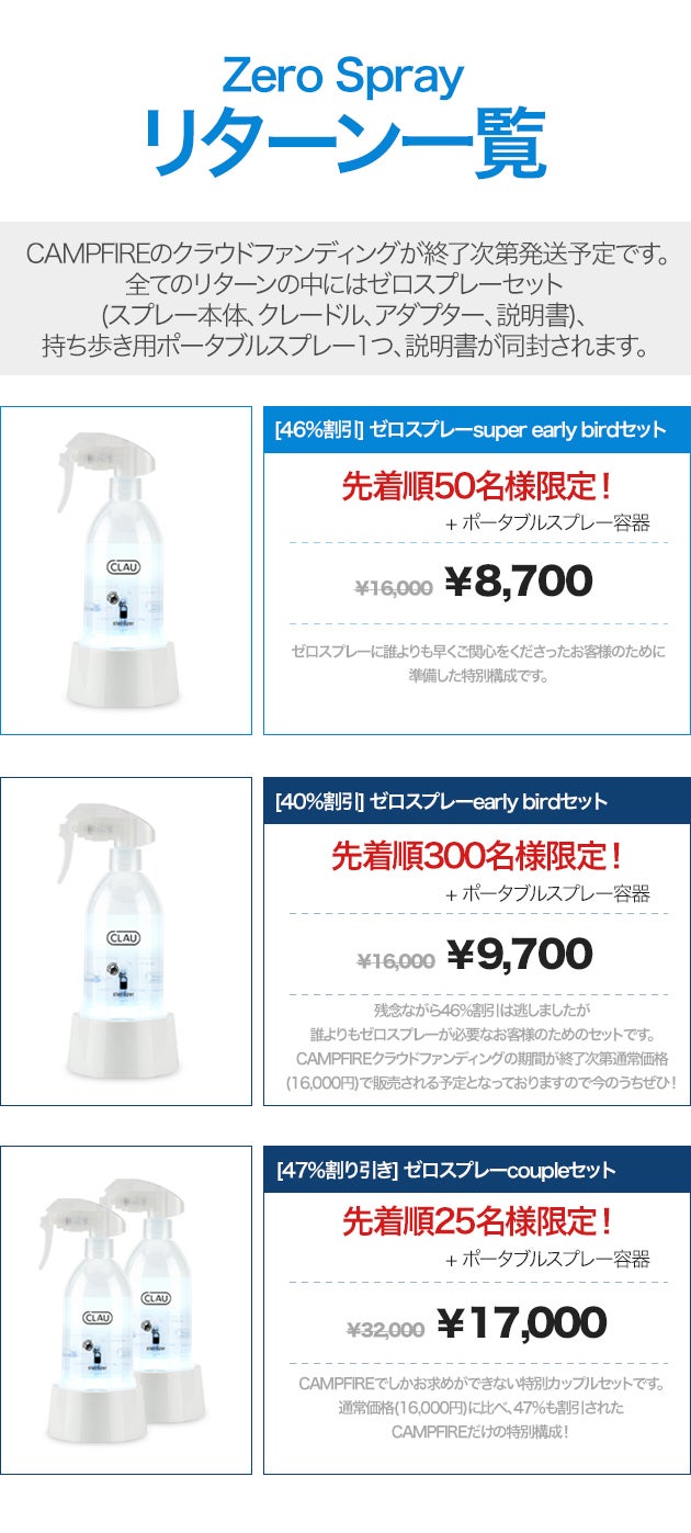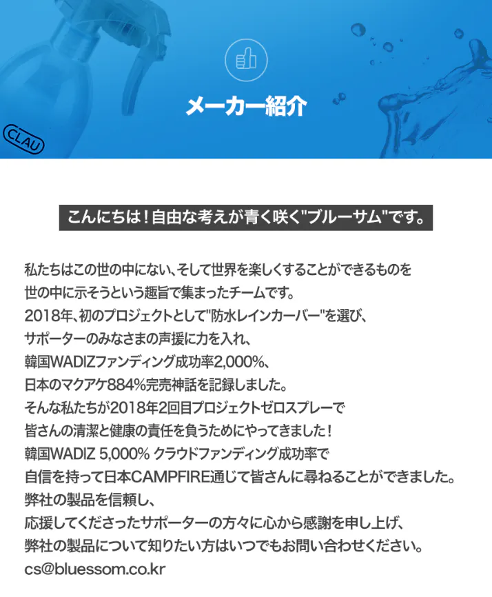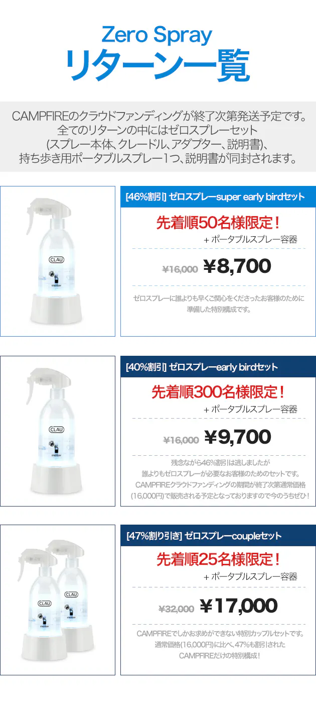 2019/01/31 12:57皆様のご関心と愛により、ゼロスプレーが866%という驚くべき成績と共に成功的にクラウドファンディングを終えることができました。ご声援の方誠にありがとうございます。韓国は来週から新年の行事(ソルナル)があ理、1週間ほどすべての業務が中断されます。最大限早くゼロスプレーを生産及び発送準備をし、2月中旬頃正確な配送日のお知らせをさせていただきます。ゼロスプレーと共に綺麗で幸せな新年になることを心から祈ります。ありがとうございます。 もっと見る