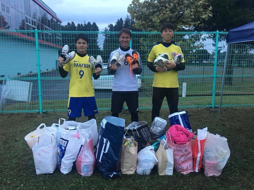 また、モンゴルリーグで活躍していた石野 秀多選手(写真中央)、そして菱田 拓選手(写真左)とともに日本でサッカー教室を開催し、参加費の代わりとして不要になった衣服を参加者に持参していただきました。