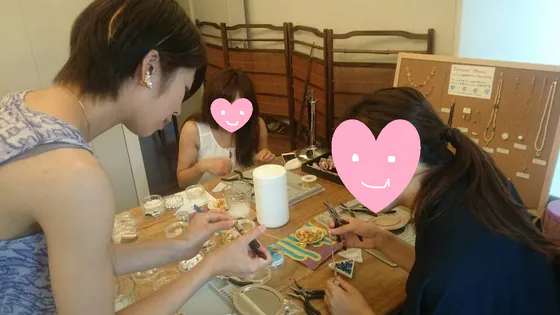実は、皆様をアクセサリー工房にお迎えするにあたり、アクセサリー作りに興味がある私の友人達に協力してもらい、試験営業しています。(プライバシーのため、お顔はかくしちゃいました)