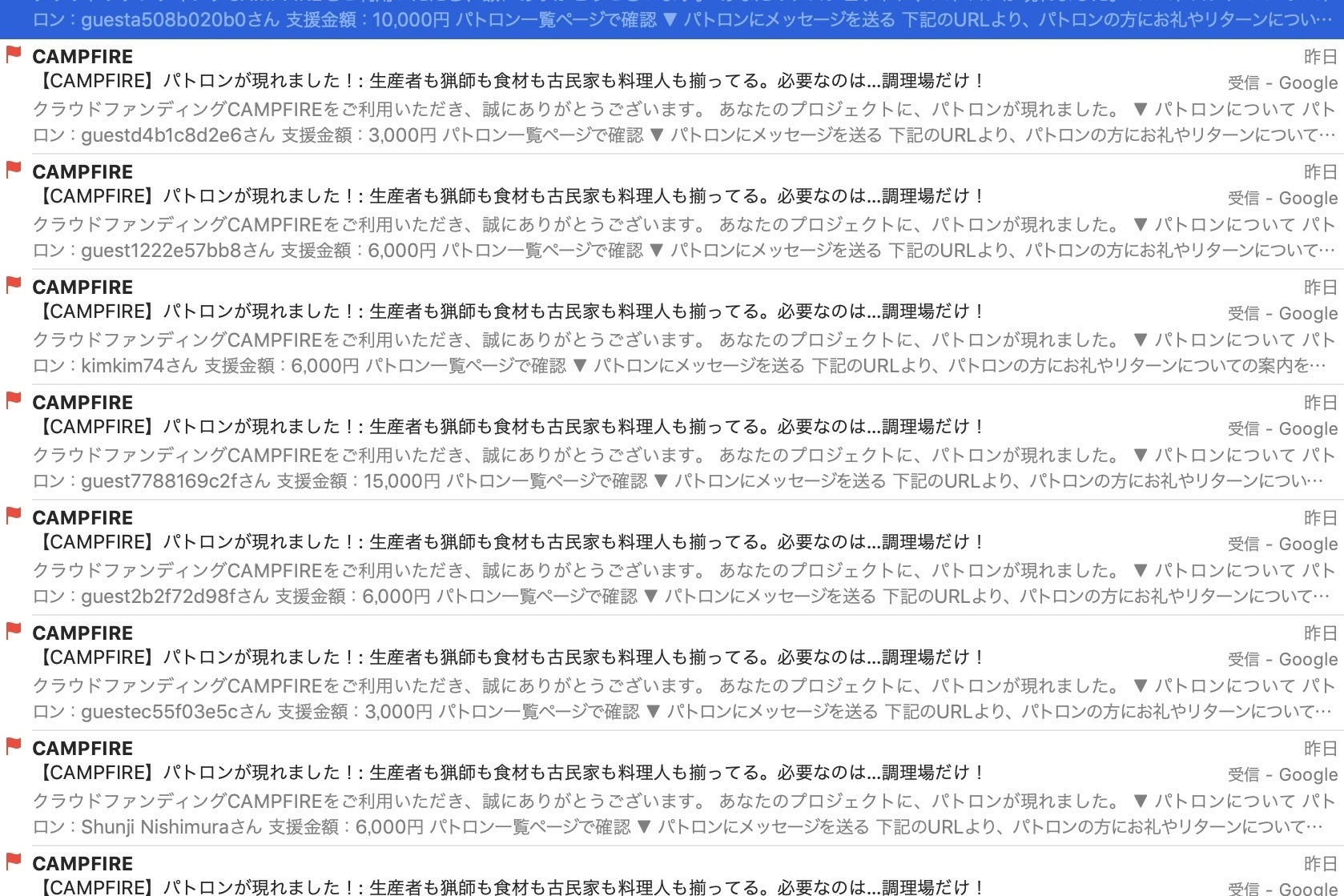 「パトロンが現れました!」メール受信画面ちょっとというかかなりテンション上がる!ゲーム感覚 DQ5みたいな?スタートダッシュに成功したかどうか、それは〆の3月31日までわからないとこだけど、初日にこれだけは達成したい!と思ってた個人的な目標、① 支援者10人以上欲しいなぁ。② サシ飲み1人以上欲しいなぁ。③ 知らない人1人以上欲しいなぁ。の3つ。全てクリアできたことはありがたい。みんな本当にありがとう☆みんなありがとう!▼ クラウドファンディング初日 運命の24時間の鉄則① 公開日は基本パソコンから離れない。② SNSでシェアやコメントくれた全ての人に大至急感謝の意を伝える。③ SNSでいいね!くれた全ての人に大至急メッセージを送り、シェア、コメント、あわよくば支援の依頼をする。▽ ▽ ▽ ▽ ▽① クリア。② 一応クリアかな?③ は…難しかった。全ての人にメッセージ送れなかった。最初ノリで数人やったけど間に合わない。がっつきすぎじゃね?ドン引きされんじゃね?って思う自分もいたし。ただ…これから事業立ち上げるんだよね?しかも自分だけじゃなく関わったみんなハッピーになるためのお惣菜屋さん創るんだよね?って考えたら、ドン引きされるとかがっつきすぎとか恥ずかしいとか。そんなことで悩むことが筋違い。経営者ってのは覚悟が、背負うものが違うんだ。やろうとしていることに自信あれば尚更。1回転した恥ずかしさ克服法。おすすめだよ☆普段絶対やらないけど。facebookシェア 227は衝撃的ほんまにみんなありがとう!結果。自分で投稿、コメント、シェアしてくれた人へのいいね!などで稼いでる部分もあるけど。せいぜい120〜30がいいところ。って考えたら227って数字。知らないところで勝手に動いてる。炎上じゃなきゃいいけど。このリターンは炎上しやすいかもだからね。本質を見抜けない人にとっては。クラファン初日、24時間以内はお祭りみたいなものだから。よくわからないムーブメントに乗っかった。乗っかって良かった。クラファン初日の恥は旅以上にかき捨ておっけーなのだ☆新着のプロジェクトに抜擢トップページに異質な写真が!CAMPFIREさん ありがとうございます☆やったことある人にしかわからないけど結構おもしろいね◎意外な人からの支援、連絡、拡散、助言。たくさんもらえる☆久しぶり、初めまして。旅してる感覚に近いかも。本音の本音は初日で10%クリアだったんだけど…数字に囚われすぎると本来の目的を見失いがちだから当初の目的、① かっこいい田舎を知ってもらうこと。② かっこいい田舎に興味持ってもらうこと。③ 繋がること。の3つ。どう転んでも達成される。と考えたら公開した段階で目的クリアしてるんだよね。シェア227だし。その先の目的で不特定多数とより深く強く繋がるってのがあるけれど。念願のサシ飲みパトロン第1号!楽しみすぎる!知らない人とサシ飲みはやっぱりハードル高い?そして長文だからこその本領発揮は長時間を擁するはず。支援するに至るまでに。サシ飲みとか出稼ぎとか再現とか。じっくり考えてくれた人があるときふっと現れる。ということに期待しながら初日24時間終了。いやぁ思った以上の持久戦で。正直参ったね☆けど嫌いじゃない、この感覚。ということでスタートダッシュ終了!ありがとうございました & おつかれさまでした。
