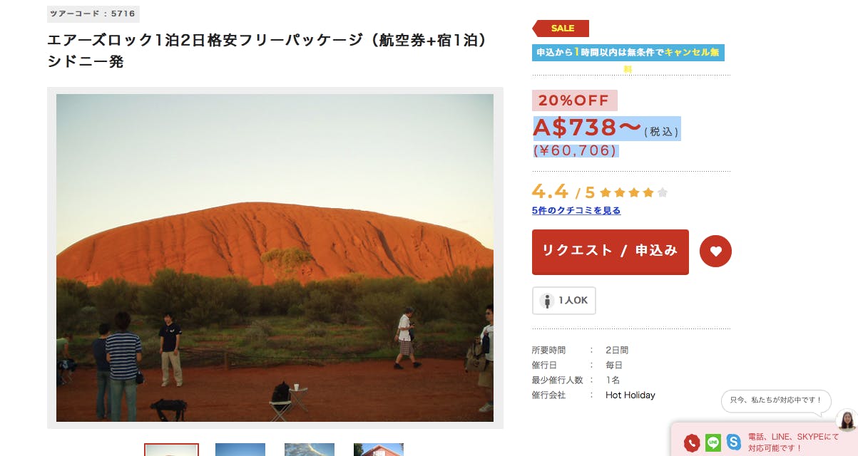 エアーズロック1泊2日格安フリーパッケージ(航空券+宿1泊)シドニー発
