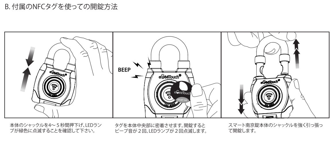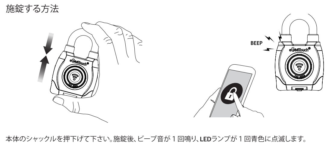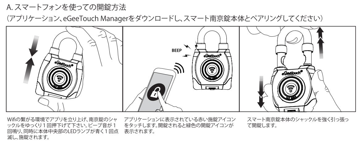 このスマートパドロックは、スマートフォンでダウンロードするアプリケーション「eGeeTouch Manager」やNFCタグなどで簡単に施錠と解錠ができます。