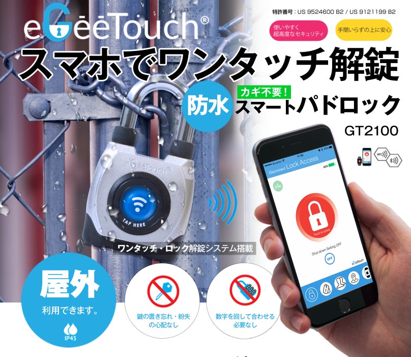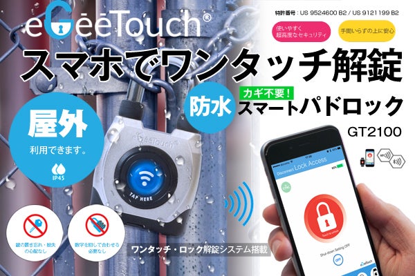 eGeeTouchのGT2100は、eGeeTouchのスマートパドロックの第3世代目の製品です。各国の特許を取得済で、これまでも外国メディアなどに高い評価をして頂きました。また、日本では第2世代が2014年のJAPAN DIY SHOW 2014を受賞しており、日本でも注目を集めた製品です。