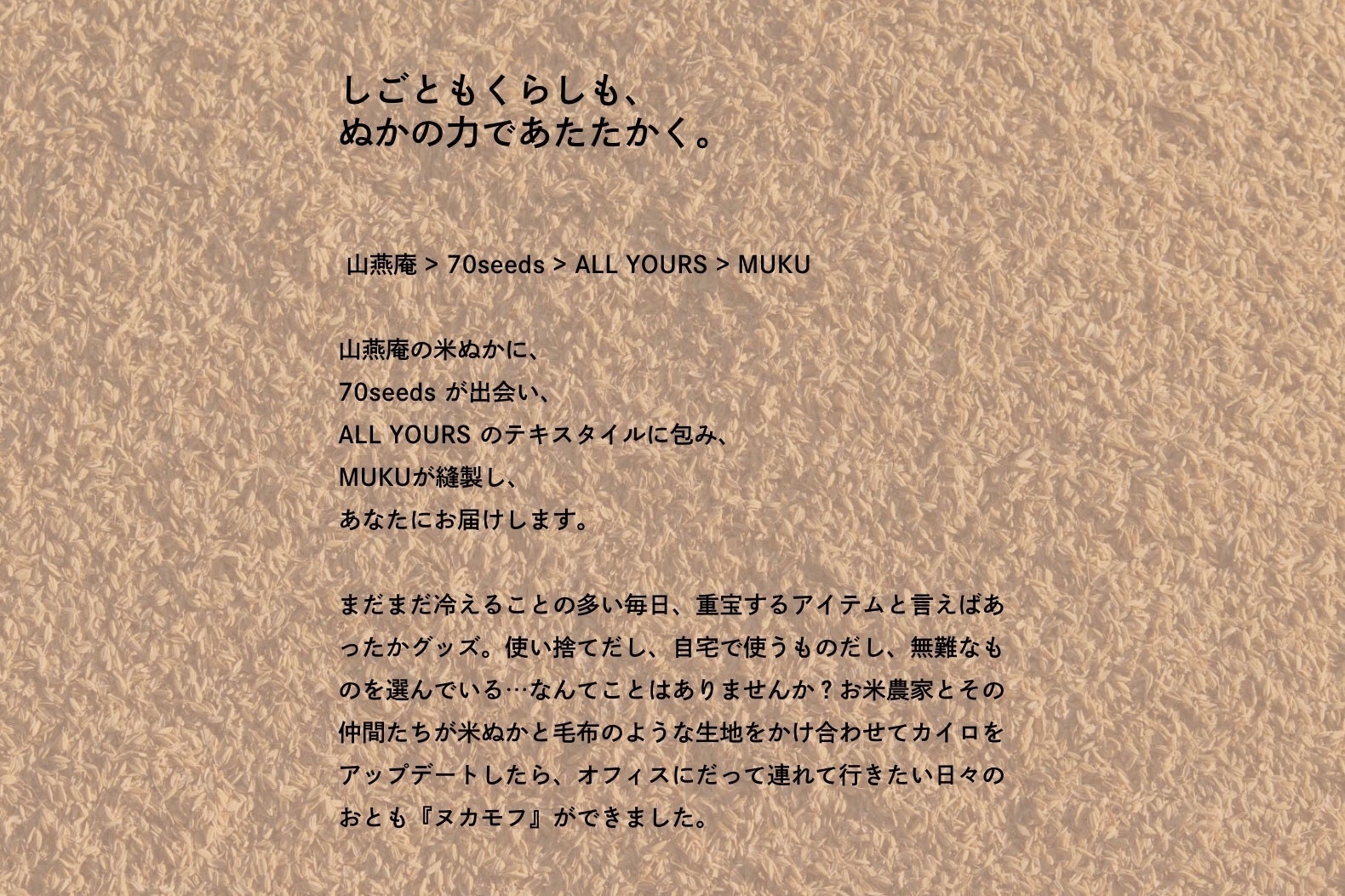 2019/03/14 18:01この度ヌカモフの特設ページができました。冷えた身体にヌカモフを当てたときの「あ〜〜」と声が出てしまう感じ。おふろに浸かったときのあの感覚だ…あの感覚を目でも味わっていただけるページになりました。ぜひご体感ください!ヌカモフのご購入はもちろん、山燕庵杉原へのインタビューやチームヌカモフのメンバーの記事もこちらから。商品を生んだ「人」のストーリーを知ると、同じものでも違って見えてくるからふしぎです。そんなふしぎを感じてもらえたらチーム一同こんなに嬉しいことはありません。今後の展開もお楽しみに。FBメッセンジャーグループ「モフトーク」でもわいわいやっています。みんなでつくるヌカモフの今後!参加はお気軽に。70seeds@am-inc.co.jpにFacebookのアカウントをお知らせください。 もっと見るお礼。追加生産のお知らせ&メディア掲載情報