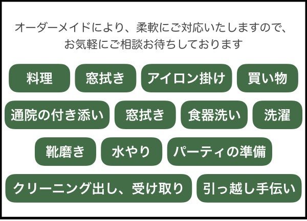 日常のお掃除から、お料理、買い物、洗濯など、ご要望に合わせた家事を行います。