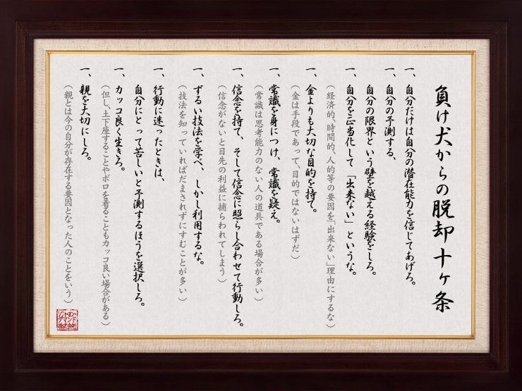 ↑高橋氏がソフト・オン・デマンドの社訓に掲げた「負け犬からの脱却十箇条」
