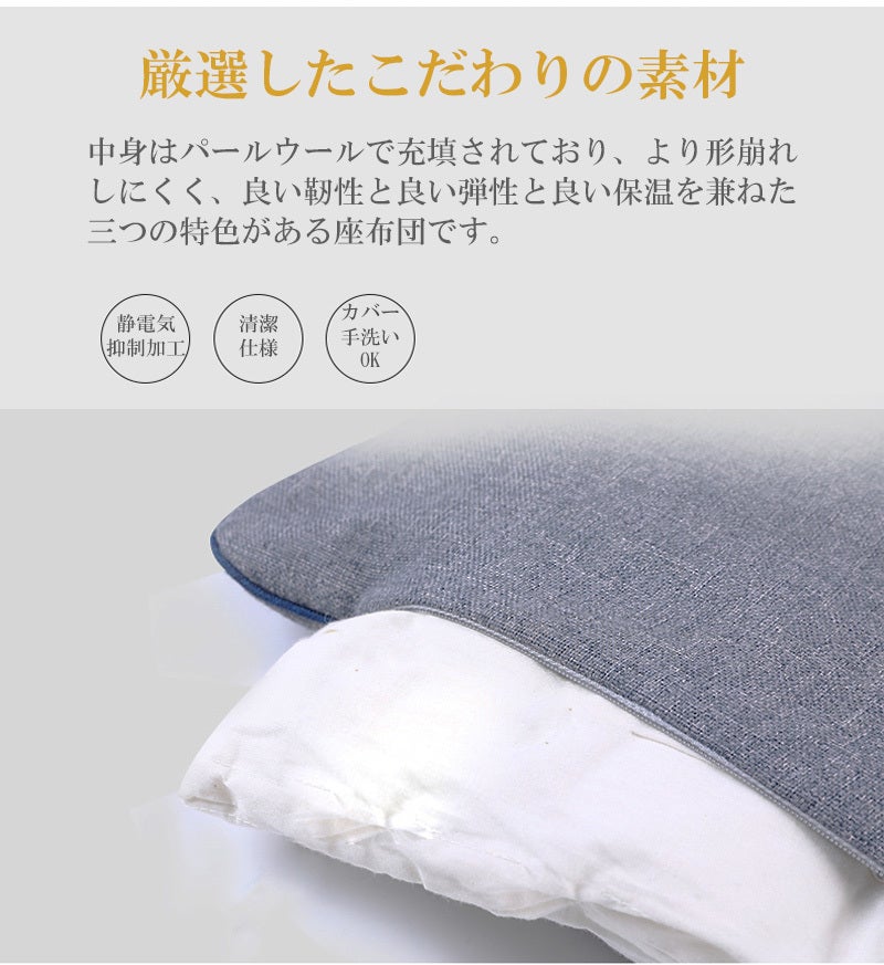 パールウールは新世代の素材で環境保護により配慮されております。特徴として静電気の発生を防ぎ、撥水、防湿、衝撃吸収や防音効果が期待できます。変形しにくく高性能な素材なので従来の座布団やクッションなどの中身として理想的な代替素材です。
