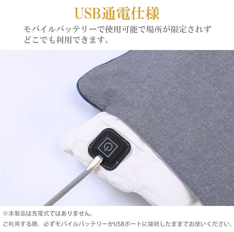 5V 2Aの出力ができるアダプターがあればもちろん、モバイルバッテリーでもこの基準を満たしていればどこでも使用可能になります!安全上座布団から放熱されますので内蔵バッテリーの充電式ではありませんが、コンセントとモバイルバッテリーの両方で使用することができます!