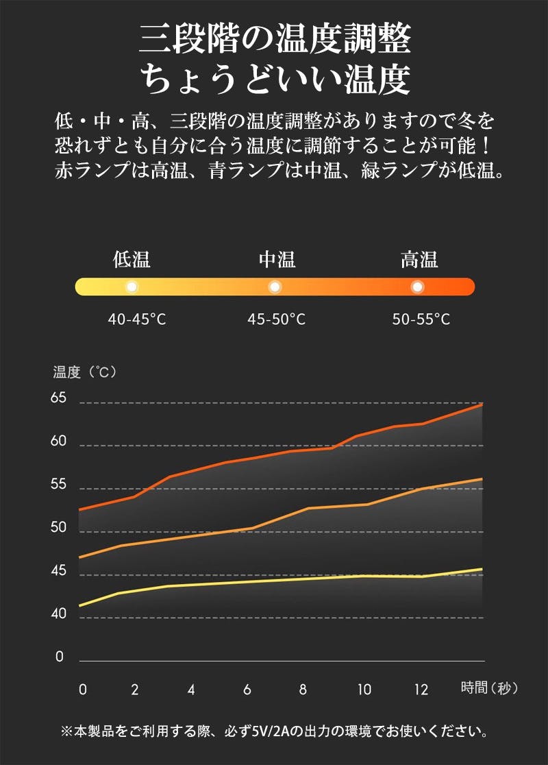 暖房器具はやはり通常のコンセントが多かったのですが、使える場所が限られてしまいますので、USBからの電力供給仕様を採用。これにより場所を選ばずともモバイルバッテリーがあればいろんな場所でご利用いただけます。