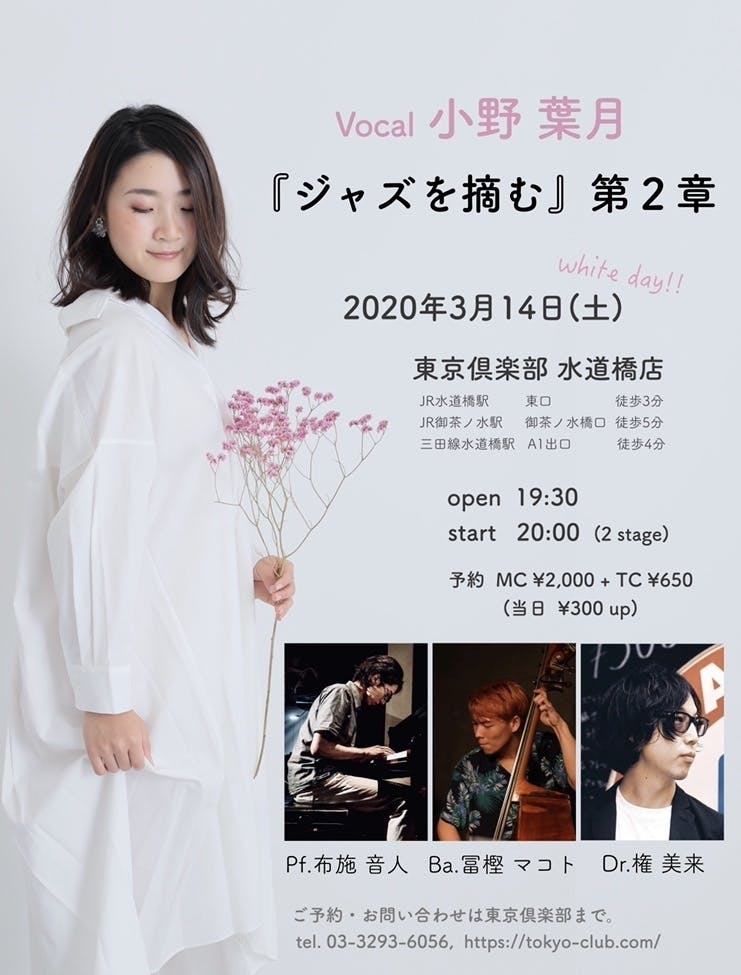 2020/02/21 20:00皆さま!お久しぶりでございます!小野葉月です。寒い日々が続いておりますが、いかがお過ごしでしょうか?小野葉月『ジャズを摘む』CD&LIVE プロジェクトの成功から、早一年が経過いたしました。私は活動拠点を関西から東京に移し、ジャズを歌い続けております。そしてこの度、『ジャズを摘む』第2章と題しまして、東京でのライブを開催することになりました。お近くにお住まいの方は是非お越しくださいませ。◼︎3/14 (土) 東京倶楽部水道橋店小野葉月 (Vo) 布施音人 (Pf) 冨樫マコト (Ba) 権美来 (Dr)open 19:30 / start 20:00予約 ミュージックチャージ ¥2,000 + テーブルチャージ ¥650(当日¥300 UP) ご予約はコチラCD収録曲を交えつつ、新しい曲やアレンジにも挑戦するライブとなる予定です。共演させて頂くミュージシャンの方々も本当に素晴らしいので、是非!ーーーーーーーーーーーーーーーーーーーーーーーーーーーーーーーーーーーーーその他のライブ情報もまとめてお知らせ致します!◼︎2/29 (土) ちゅうりん庵 (読売ランド)小野葉月 (Vo) 石井義信 (Gt) 中林創造 (Ba) 利光玲奈 (Dr)open 15:30 / start 16:00MC ¥2,500http://tmpb.music.coocan.jp/tone/tonecreate.htm直近ですが。。。初めての方々との共演でワクワクしております!ちゅうりん庵はとてもアットホームなお店で、手作りご飯がとっても美味しいです。そしてビールがお安い!!!◼︎3/4 (水) コントレイル銀座小野葉月 (Vo) 杉山慧 (Gt)open 19:30 / start 20:00MC ¥3,500 + TC ¥2,000 日替わりフード付きhttp://contrail-group.com銀座にあるお洒落な隠れ家です。日替わりの夜ご飯は給食と呼ばれていて、お客様からもミュージシャンからも大人気。初出演なのでドキドキです!杉山慧くんは歳が近い素晴らしいギタリストです。◼︎3/28 (土) キンのツボ (用賀)CHAKA Vocal Showcase権美来・小野葉月・星野亜美・CHAKA (Vo)後藤沙紀 (Pf) 遠藤定 (Ba) 田中涼 (Dr)open 19:00 / start 19:30MC ¥2,000https://kinnotsubo.comこちらのライブはプライベートイベントとなりますので、ご予約の際には私までご連絡くださいませ。CHAKA大先生とその生徒3人によるShowcaseです。居酒屋で焼き鳥を食べながら4人ものシンガーの歌を聴けるというスペシャルLIVE!!安心のピアノトリオに支えてもらいつつ、ボーカルデュオなんかもやっちゃいます。◼︎5/28 (木) Strings (吉祥寺)小野葉月 (Vo)武藤勇樹 (Pf)open 18:30 / start 19:30MC ¥2,700http://www.jazz-strings.com/index.htm#少し先ですが・・・生地から手作りの美味しいピザが食べられるアットホームなお店です。武藤さんのダイナミックなピアノに乞うご期待くださいませ。実はピアノとデュオは初めてです。ご予約に関してやその他ご質問等ございましたら、お気軽にメッセージやコメントお寄せください!皆さまにどこかでお会いできる日を楽しみしております。最後まで読んで頂き、ありがとうございました♪小野葉月 もっと見る