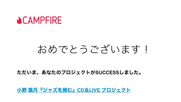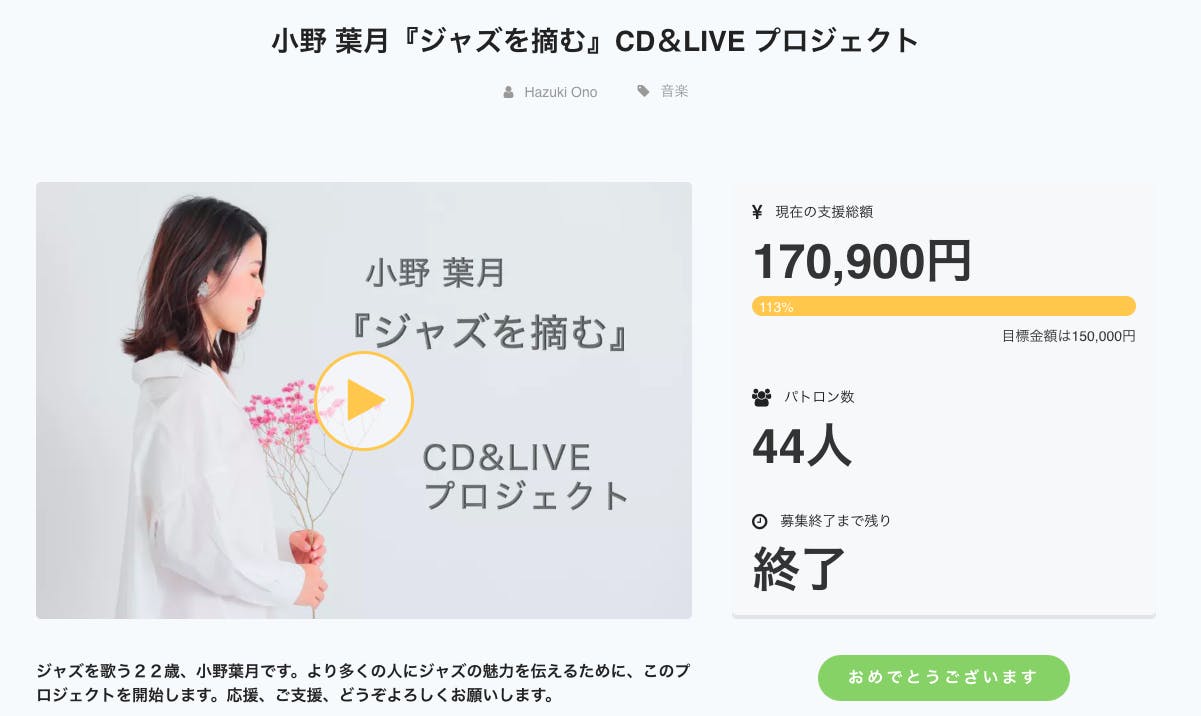 2019/01/25 01:46小野葉月『ジャズを摘む』プロジェクトは、皆様のおかげで無事に終了致しました。最終的な支援総額は、170,900円となりました。113%達成です!改めてご支援、応援、してくださった皆様に感謝いたします。LIVEまであと一週間、全力で頑張ります。CDもあと2日ほどで到着いたします。今後もCDの発売は続けて参りますので、よろしくお願いいたします。では、ご報告まで。 もっと見る