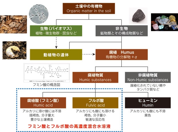腐植物質は、アルカリに溶ける「フミン酸」、アルカリと酸に溶ける「フルボ酸」、