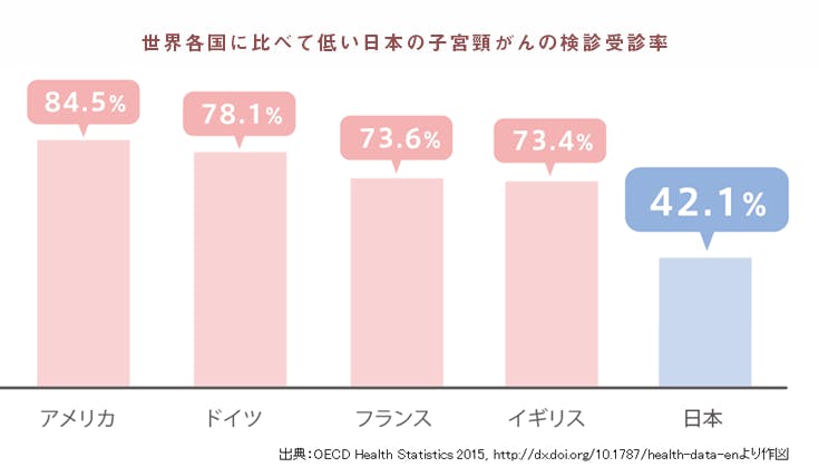 厚生労働省では、20歳以上の女性に2年に1回検診を受けることを推奨しています。ところが日本における検診率はとても低く、欧米諸国の検診率平均が70〜80%以上にも関わらず、日本はわずか42.1%、20代は22.2%です。※「OECD, OECD Health Data 2015, Nov 2015」「2013年国民基礎調査」より