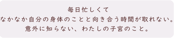 シンクパールの活動を通して知った、私たちの世代にも多い子宮頸がんのこと。私自身、生理痛がきっかけで長いこと産婦人科に通って検査を受けるようになりました。ところが意外なことに、定期的に産婦人科に通い検診を進んで受ける同年代の女性がとても少ないのです。忙しい中なってもいない病気と向き合う時間を作るのももったいない。当然のことだと思います。