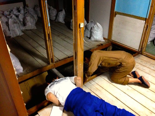 写真は、メンバー柴田と木村で床下の状態をチェックしている様子です。